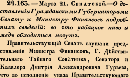 24163. 1810 год. 21 марта (2 апреля). Сенатский. О доставлении Гражданскими Губернаторами Сенату и Министру Финансов подробных сведений: во что кабацкое пиво и мед обходиться могут