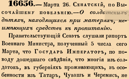 16656. 1843 год. 7 апреля (26 марта ст.ст.) Сенатский, по Высочайшему повелению. О солдатских детях, находящихся при матерях, неимеющих средств к пропитанию.Правительствующий Сенат слушали рапорт Военнаго Министра, полученный 5 числа сего Марта, что Государь Император, по поводу дошедшаго сведения, что многия из солдаток, в губерниях проживающих, в особенности из Татар,. Чуваш и Черемис, не имея никаких средств к пропитанию, оставляют при себе сыновей кантонистов из одной лишь материнской привязанности, не решаясь отлучать от себя до двадцати летняго возраста <...>