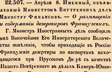 22507. 1807 год. 8 апреля (20 апреля). Именный, объявленный Министром Внутренних дел Министру Финансов. О размещении и содержании дезертиров Французских.