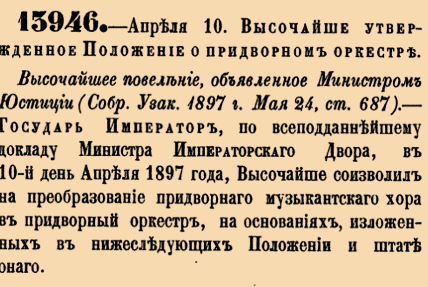 13946. 1897 год. 22 апреля (10 апреля ст.ст.) Высочайше утвержденное Положение о придворном оркестре.Высочайшее повеление, объявленное Министром Юстицими. Госудаоь Император, по всеподданейшему докладу Министра Импраторскаго Двора, в 10-й день Апреля 1897 года, Высочайше соизволил на преобразование придворнаго музыкантскаго хора в придворный оркестр, на основаниях, изложенных в нижеследующих Положении и штате онаго <…>