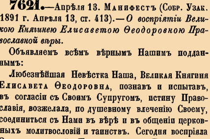 7621. 1891 год. 25 апреля (13апреля ст.ст.) Манифест. О восприятии Княгинею Елисаветою Федоровною Православной веры.Объявляем всем верным Нашим подданным: Любезнейшая Невестка Наша, Великая Княгиня Елисавета Федоровна, познав и испытав, в согласии с Своим Супругом, истину Православия, возжелала, по душевному влечению Своему, соединиться с Нами в вере и в общении церковных молитвословий и таинств <…>