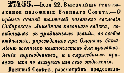 27455. 1853 год. 3 августа (22 июля ст.ст.) Высочайше утвержденное положение Военнаго Совета. О приеме детей толмачей казачьяго сословия Сибирскаго Линейнаго казачьяго войска, состоящих в урядничьем звании, в особое отделение, учрежденное при Омском баталионе военных кантонистов для приготовления переводчиков, и о служебных правах их по выпуске из сего отделения <…>2. Тех из сих воспитанников, которые, при хорошем поведении, окажут на публичном испытании лучшие успехи в науках, особенно в Татарском и Монгольском языках, выпускать, по окончании ими полнаго курса в означенном отделении, в переводчики, отличнейших старшими, а прочих младшими урядниками <…>