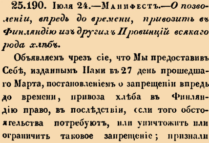 25190. 1812 год. 24 июля (5 августа). Манифест. О позволении, впредь до времени, привозить в Финляндию из других Провинций всякаго рода хлеб.