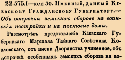22575. 1807 год. 11 августа (30 июля ст.ст.) Именный, данный Киевскому Гражданскому Губернатору. Об отсрочке земских сборов на воинския постройки и на почтовые домы. Разсмотрев представление Киевскаго Губернскаго Маршала Тайнаго Советника Козловскаго, от имени Дворянства учиненное, об отсрочке особенных земских сборов на воинския постройки и на почтовые домы, в течение трех лет расположенных, так как и сведения от вас по сему предмету доставленныя, и находя причины в представлении Губернскаго Маршала подробно означенныя, основательными, повелеваю: сбор на вышеозначенныя постройки отложить до того времени, как количество их по соображению настоящей в них потребности, вновь определится <...>