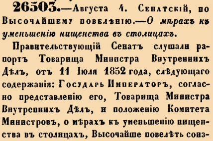 26503. 1852 год. 4 августа (16 августа). Сенатский, по высочайшему повелению. О мерах к уменьшению нищенства в столицах.