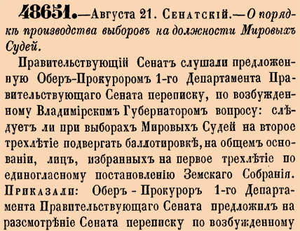 48651. 1870 год. 2 сентября (21 августа ст.ст.) Сенатский. О порядке производства выборов на должности Мировых Судей.Правительствующий Сенат слушали предложенную Обер-Прокурором 1-го Департамента Правительствующего Сената переписку, по возбужденному Владимирским Губернатором вопросу: следует ли при выборах Мировых Судей на второе трехлетие подвергать баллотировке <...>