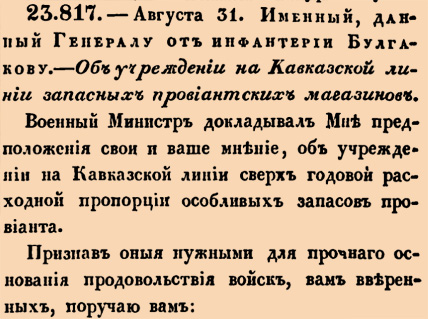 23817. 1809 год. 12 сентября (31 августа ст.ст.) Именный, данный Генералу от инфантерии Булгакову. Об учреждении на Кавказской линии запасных провиантских магазинов.Военный Министр докладывал Мне предположения свои и ваше мнение, об учреждении на Кавказской линии сверх годовой расходной пропорции особливых запасов провианта <…>