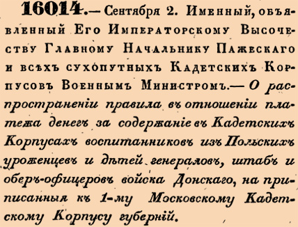 16014. 1842 год. 14 сентября (2 сентября ст.ст.) Именный, объявленный Его Императорскому Высочеству Главному Начальнику Пажескаго и всех сухопутных Кадетских Корпусов Военным Министром. О распространении правила в отношении платежа денег за содержание в Кадетских Корпусах воспитанников из Польских уроженцев и детей генералов, штаб и обер-офицеров войска Донскаго, на приписанныя к 1-му Московскому Кадетскому Корпусу губерний.