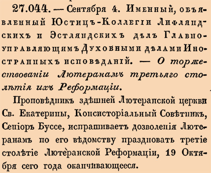 1817 год. 16 сентября (4 сентября ст.ст.) Именный, объявленный Юстиц-Коллегии Лифляндских и Эстляндских дел Главноуправляющим Духовными делами Иностранных исповеданий. О торжествовании Лютеранам третьяго столетия их Реформации.27044. Проповедник здешней Лютеранской церкви Св.Екатерины, Консисториальный Советник, Сениор Буссе, испрашивает дозволения Лютеранам по его ведомству праздновать третие столетие Лютеранской Реформации, 19 Октября сего года оканчивающееся <…>