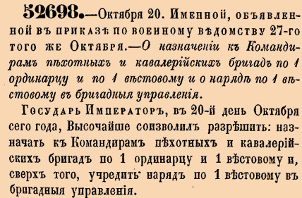 Закон № 52698 — 1873 год 1 ноября (20 октября). Указ о назначении ординарцев и вестовых командирам бригад и в бригадные управления.