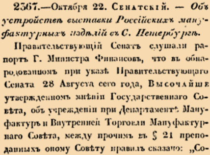 Закон № 2567 — 1828 год 3 ноября (22 октября). Указ об утверждении правил устройства первой выставки российских мануфактурных изделий в Санкт-Петербурге.