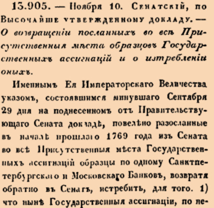 Закон № 13905. 1772 год. 10 ноября (21 ноября). Указ об изъятии из учреждений и уничтожении образцов ассигнаций ввиду их ненадобности и риска подделок.