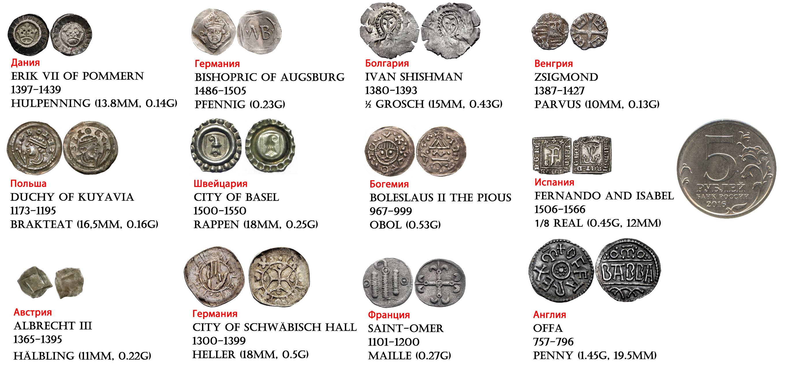 Разнообразные монеты за 700 лет на фоне пятирублевой монеты