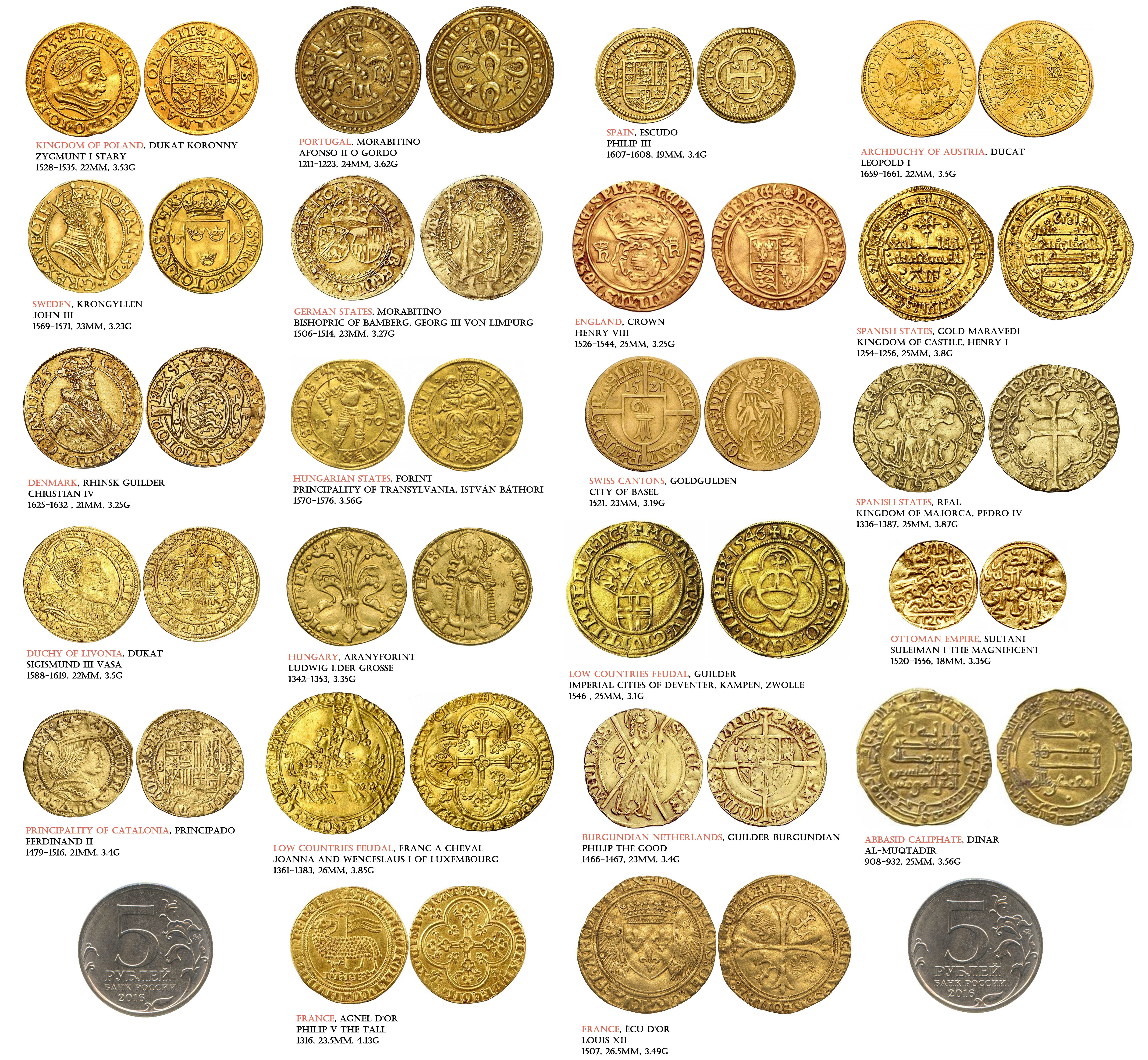 24 нелицензионные копии флорина разнообразных государств - от Османской империи до королевства Кастилия, использовавшиеся с XIII по XVIII века.