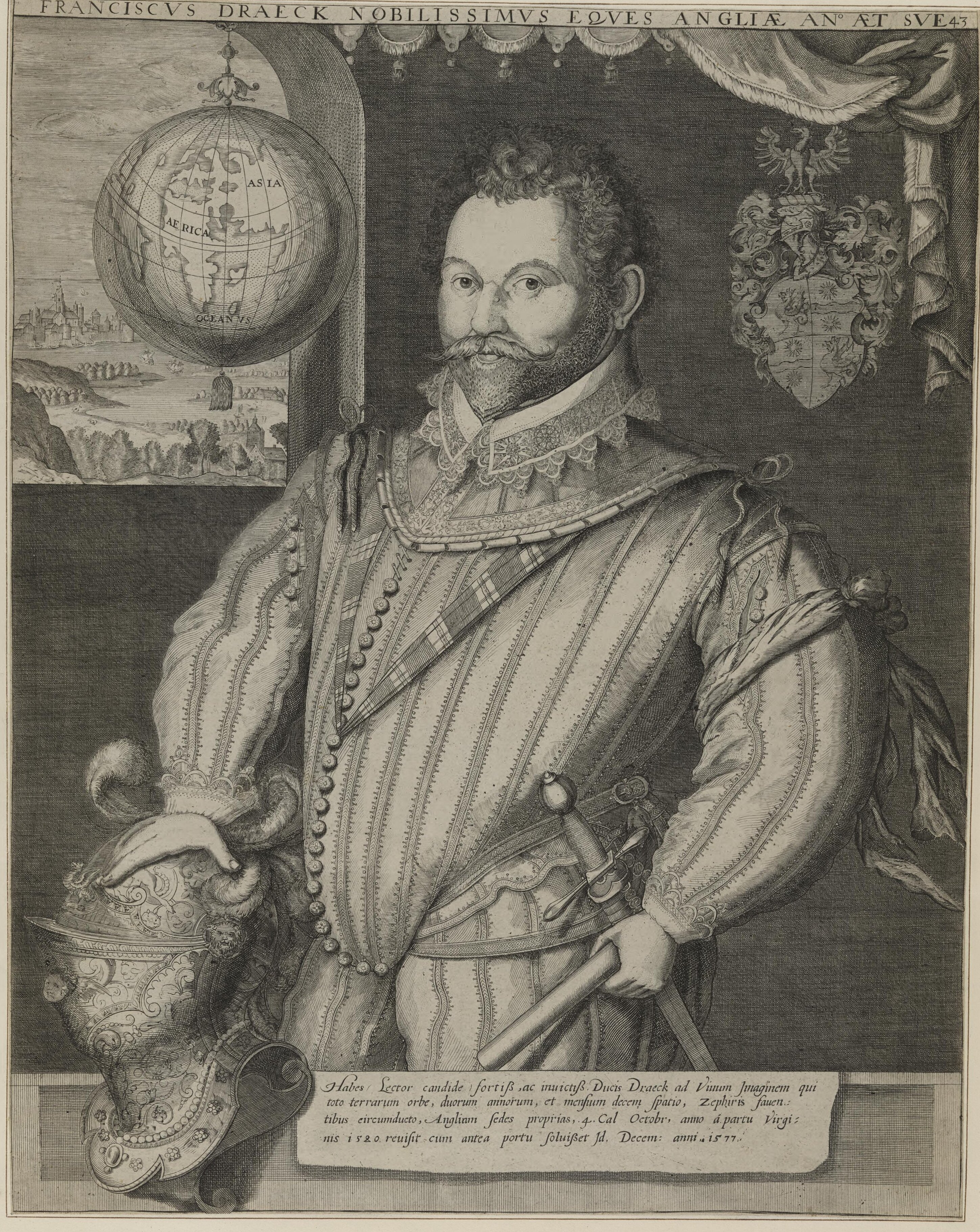 Drake is depicted standing, his right hand on a helmet, his left holding a baton. Through a window above to the left a landscape is visible; before the window hangs a terrestrial globe or two-hemisphere disc map hanging by an ornamented finial.