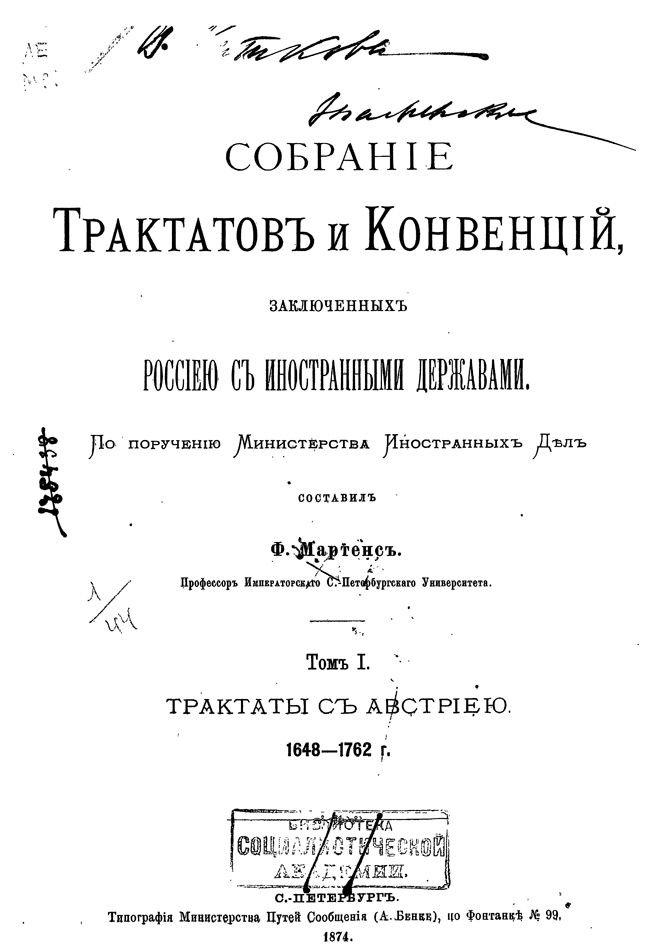 Собрание Трактатов и Конвенций, заключенных Россией с иностранными державами