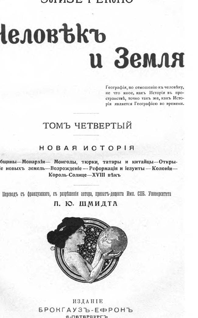 «...Мастерский свод всей литературы географии, замечательный как богатством данных и превосходных приложений — карт и рисунков, так и талантливостью изложения... «Человек и Земля» печатается одновременно на французском языке и в русском переводе».