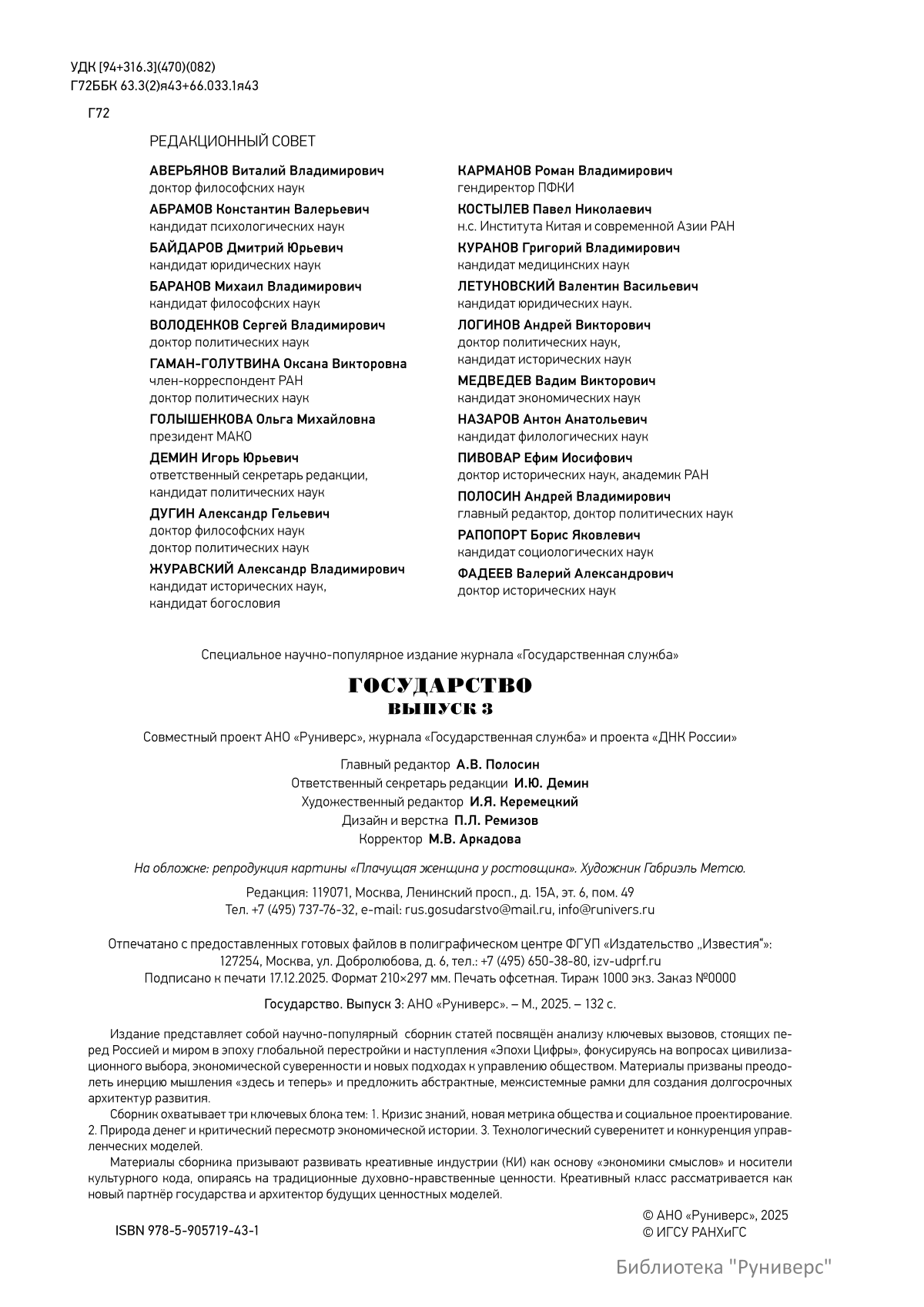 Сборник охватывает три ключевых блока тем: 1. Кризис знаний, новая метрика общества и социальное проектирование. 2. Природа денег и критический пересмотр экономической истории. 3. Технологический суверенитет и конкуренция управленческих моделей.
