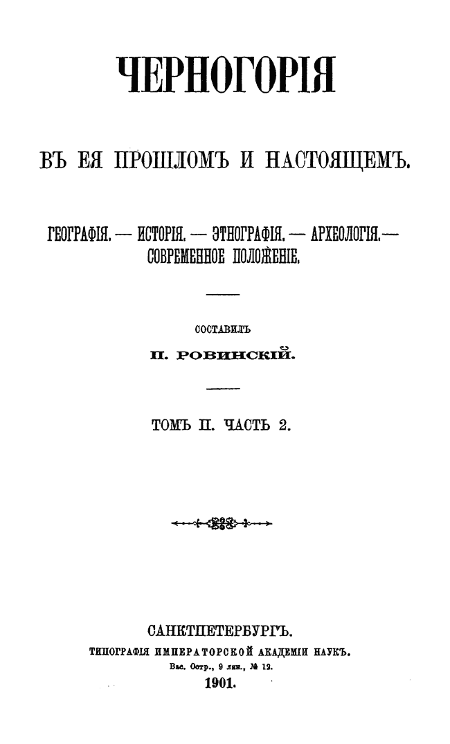 Черногория в ее прошлом и настоящем» - крупнейший вклад в науку известного русского ученого-слависта, этнографа и журналиста. П.А. Ровинский с 1879 по1906 с небольшими перерывами жил в Черногории, где сотрудничал в русской дипломатической миссии и изучал историю и этнографию страны. В своем капитальном труде он обобщает результаты своих многолетних исследований.