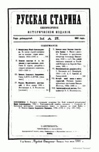 «Русская старина», ежемесячный исторический журнал, выходил в Петербурге в 1870-1918. Основан, издавался и редактировался (1870-1892) М. И. Семевским при участии В. И. Семевского. Последующими редакторами были Н. К. Шильдер (1892-1896), Н. Ф. Дубровин (1896-1904), военные историки С. П. Зыков, П. Н. Воронов.