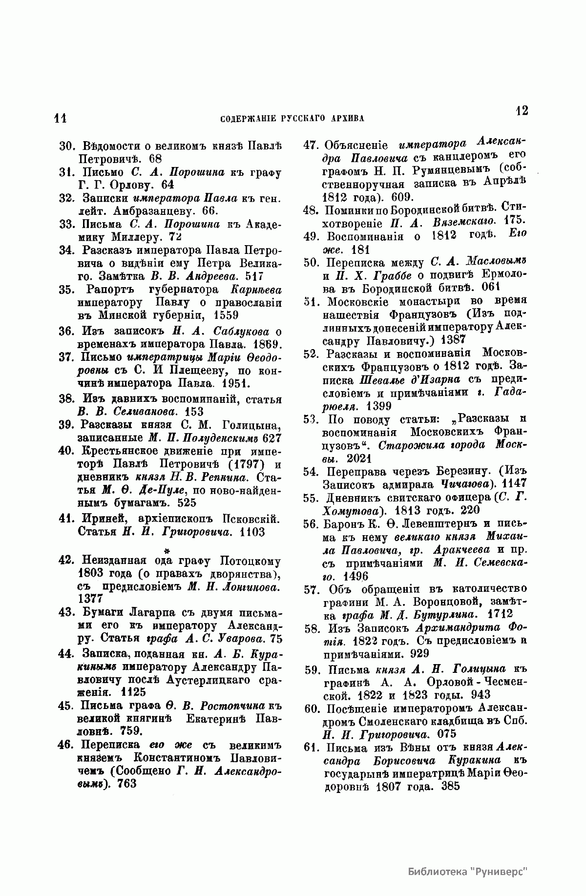 «Русский архив» — ежемесячный историко-литературный журнал, издававшийся в Москве с 1863 по 1917 год. Создателем и продолжительные годы редактором журнала был П. И. Бартенев – историк, археограф, библиограф. Этот журнал называли «живой картиной былого», поскольку он содержал преимущественно публикации неизданных мемуарных, эпистолярных, литературно-художественных и ведомственных документальных материалов, освещавших культурную и политическую историю России в XVIII и XIX вв. По числу опубликованных источников «Русский архив» стоит на первом месте среди русских исторических журналов.