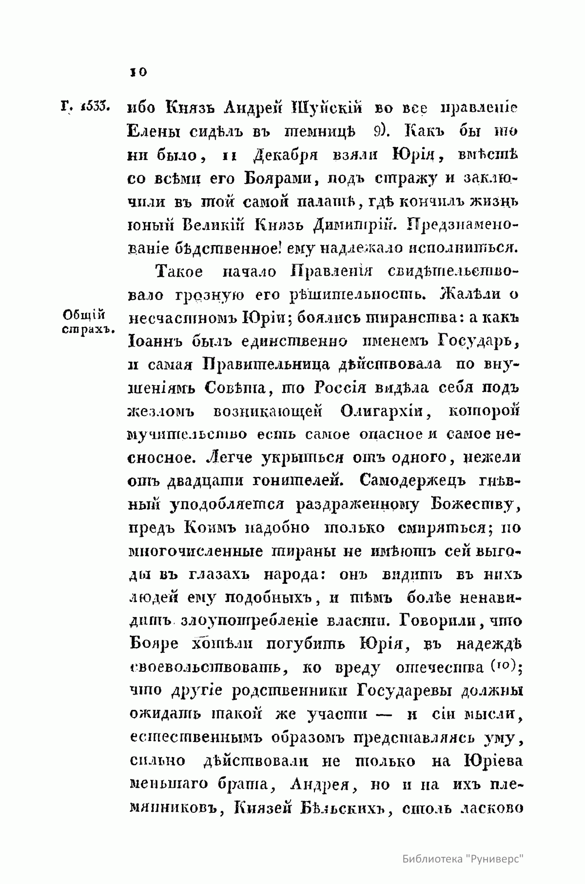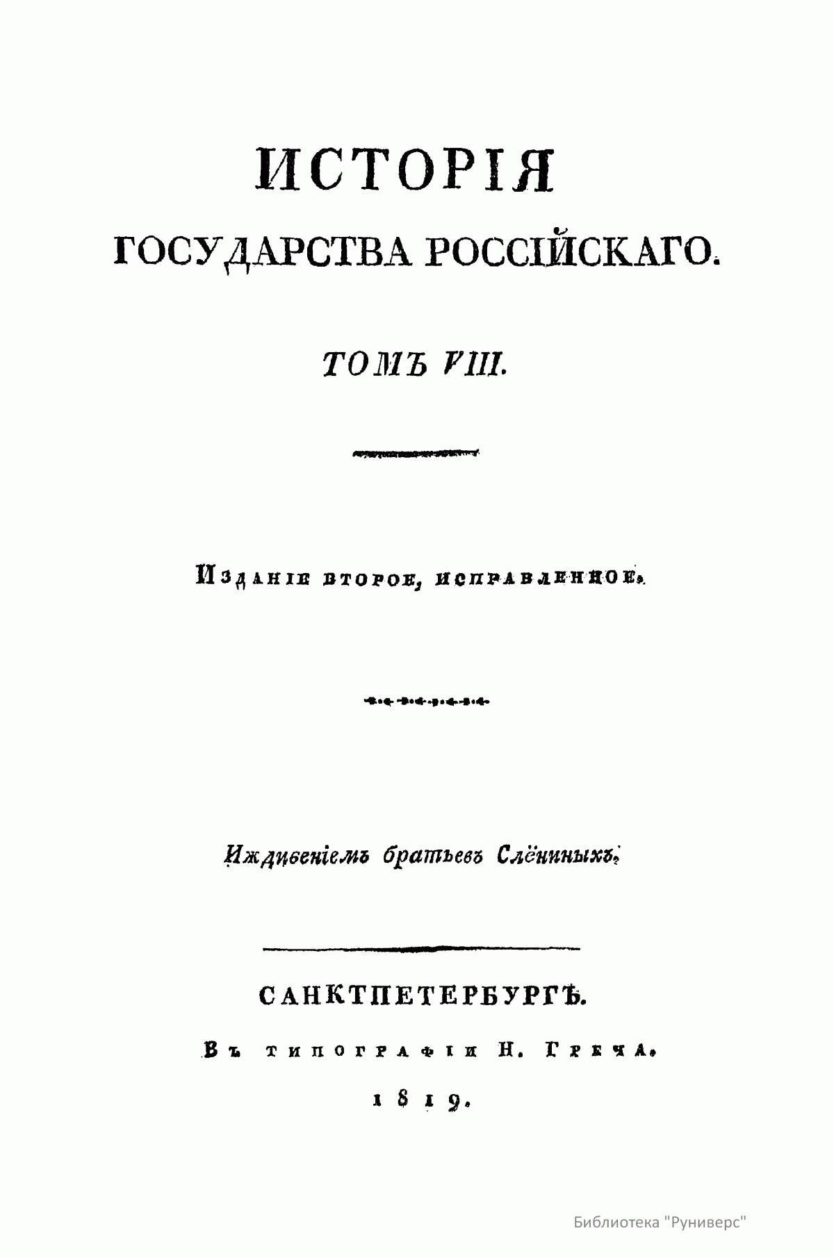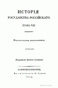 В 1816 году он выпустил первые восемь томов «Истории государства Российского», трёхтысячный тираж которых разошелся в течение месяца. В последующие годы вышли еще три тома «Истории», появился ряд переводов её на главнейшие европейские языки. Тенденциозно-монархическое освещение русского исторического процесса сблизило Карамзина с двором и царем, поселившим его подле себя в Царском Селе. Незаконченный XII том был издан уже после его смерти.