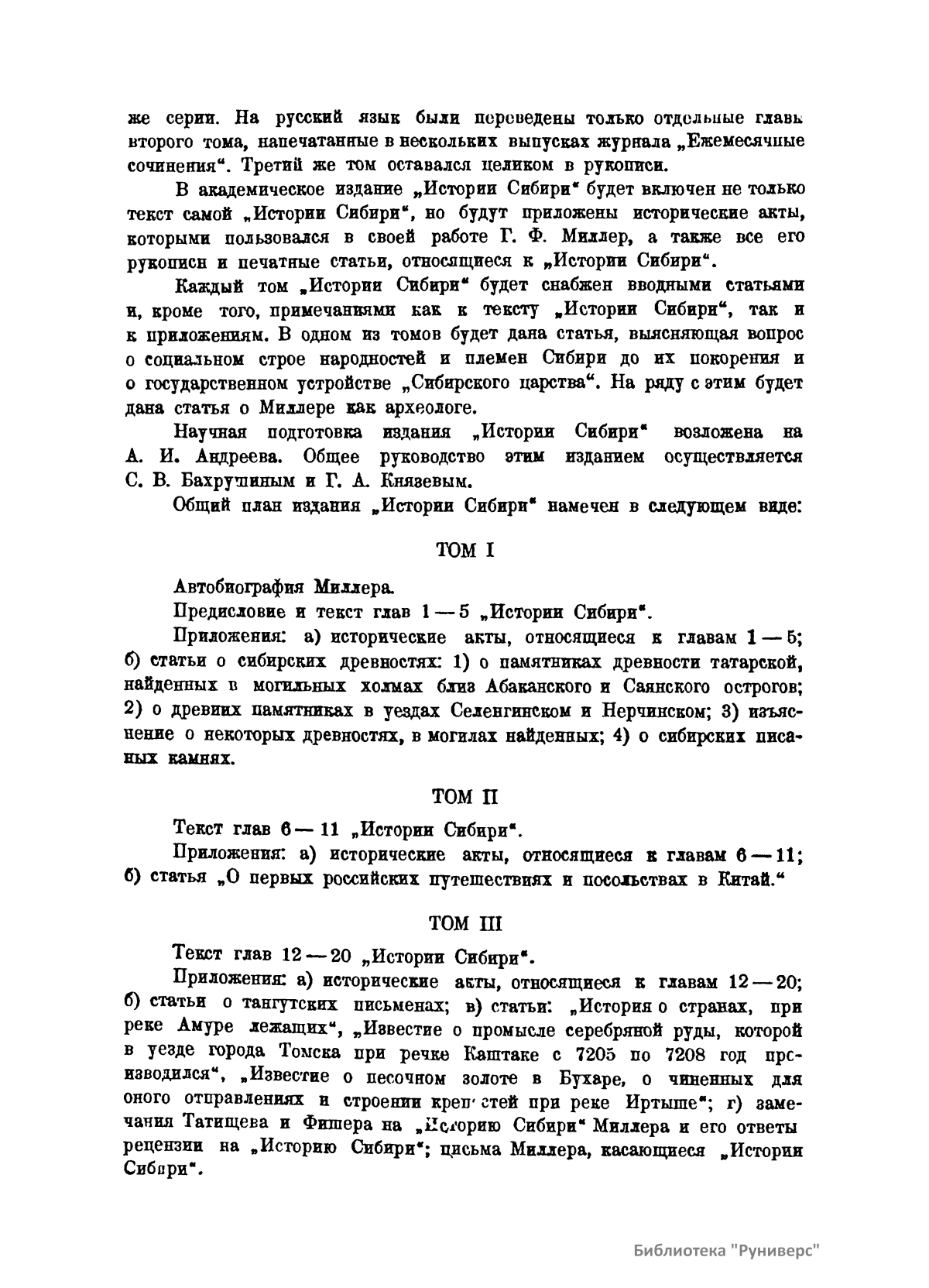 Настоящее издание – первый в истории научный труд по истории Сибири. Составлен в XVIII веке историографом академиком Г. Ф. Миллером (1705 – 1783), который был участником Великой северной экспедиции 1733 – 1743 гг. и написал пятитомную «Историю Сибири», состоящую из 23 глав. Этот труд до сих пор полностью не опубликован. Том I включает автобиографию Миллера, предисловие и текст глав 1 – 5. В «Приложении» публикуются: 1. Исторические акты, относящиеся к главам 1 – 5. 2. Статьи о сибирских древностях: а) о памятниках древности татарской, найденных в могильных холмах близ Абаканского и Саянского острогов; б) о древних памятниках в уездах Селенгинском и Нерчинском; в) изъяснение о некоторых древностях, в могилах найденных; г) о сибирских писаных камнях. Том II включает текст глав 6 – 9. В «Приложении» публикуются: а) исторические акты, относящиеся к главам 6 – 9.
