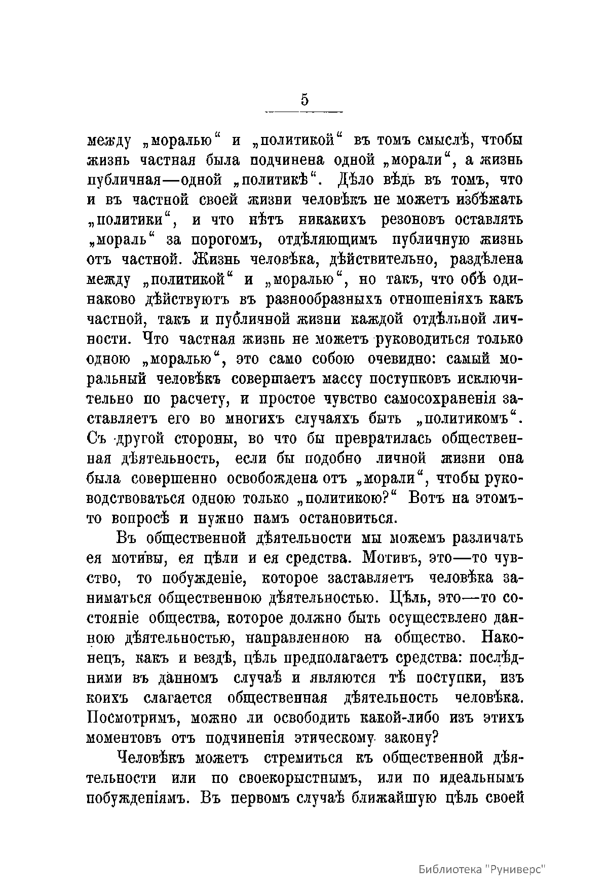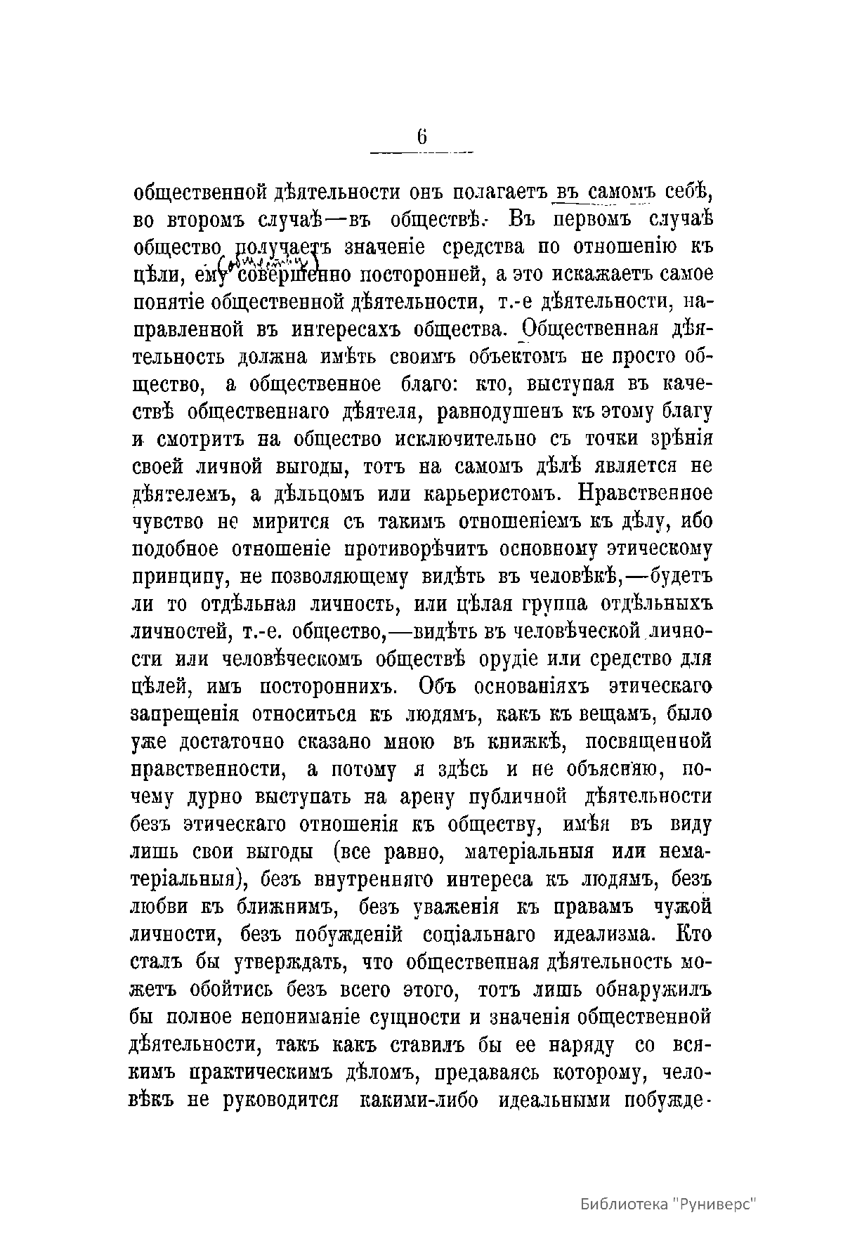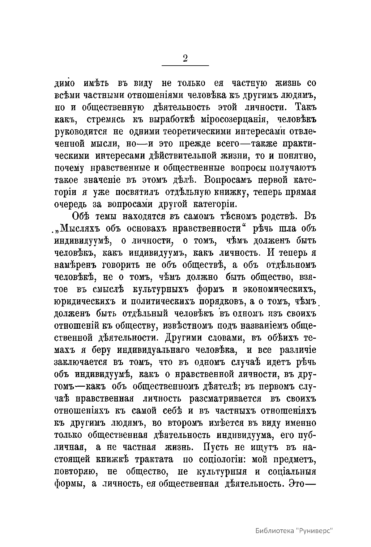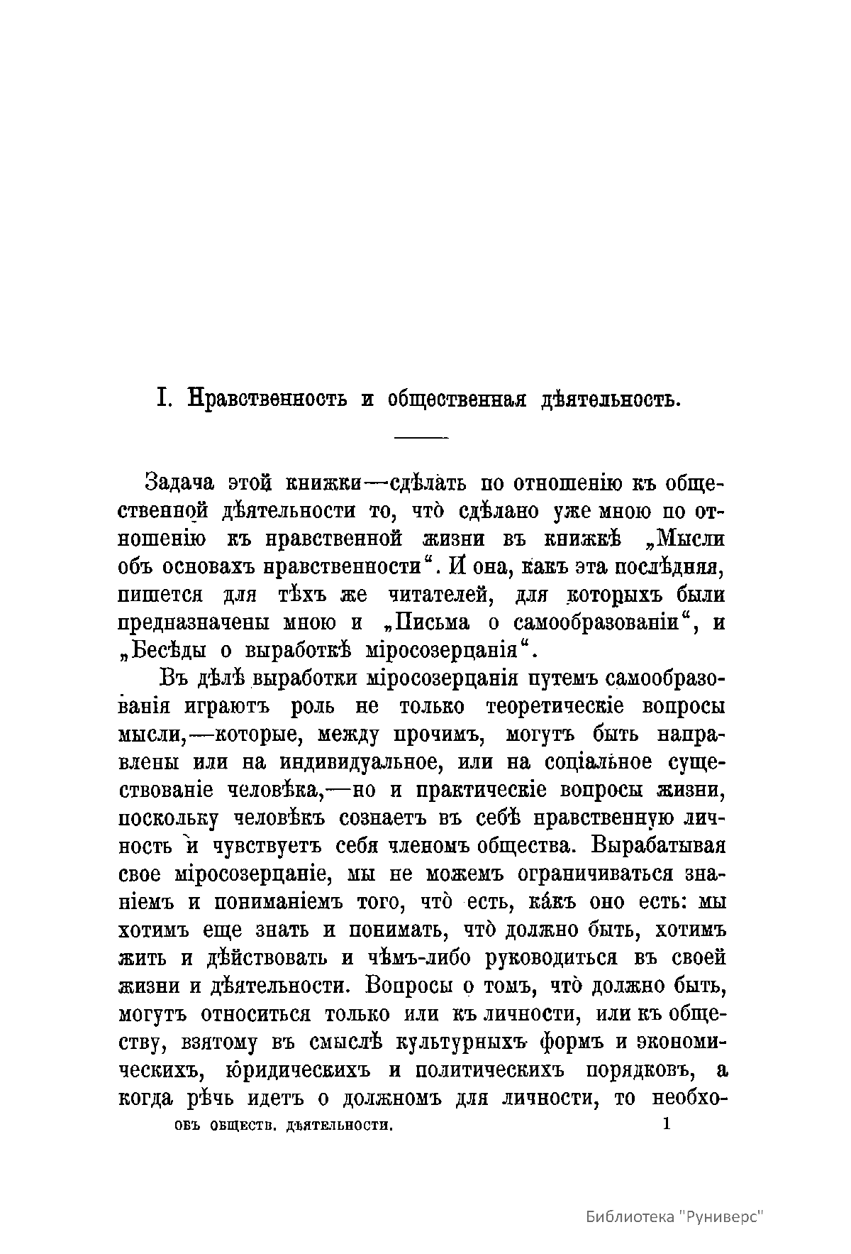 Задача этой книги - сделать по отношению к общественной деятельности то, что сделано автором по отношению к нравственной жизни в его работе «Мысли об основах нравственности», которую он начал с вопроса о цели жизни. Личность человека должна быть свободна в выборе своих целей, и это должен помнить каждый общественный деятель, если он сам чувствует себя свободной личностью. Однако если и нельзя навязывать другим свое понимание цели жизни, то из этого не следует, что нельзя доказывать другим неверности их взгляда, когда они ошибаются, и убеждать их в истинности своего, раз в этой истинности сам не сомневаешься.