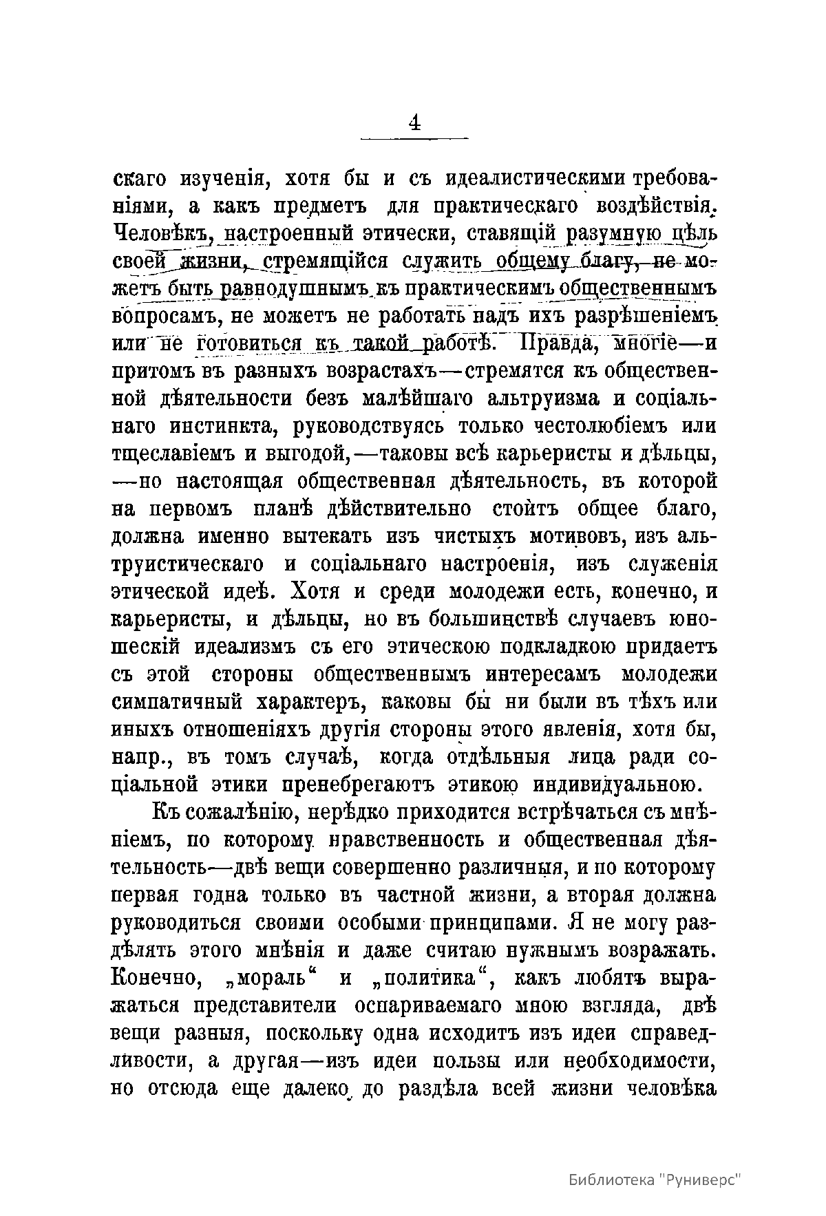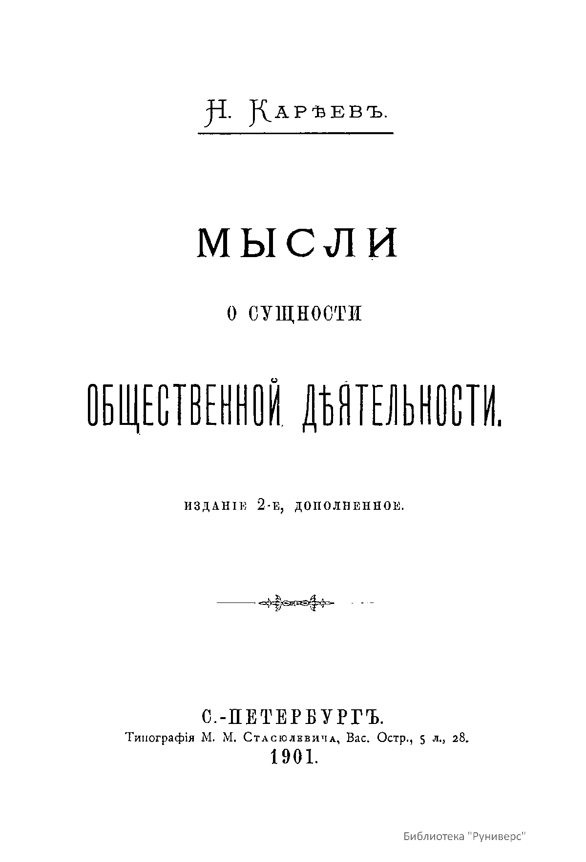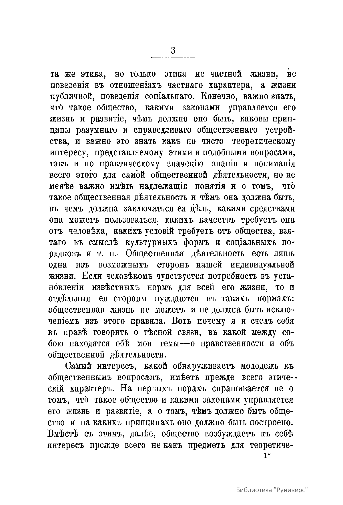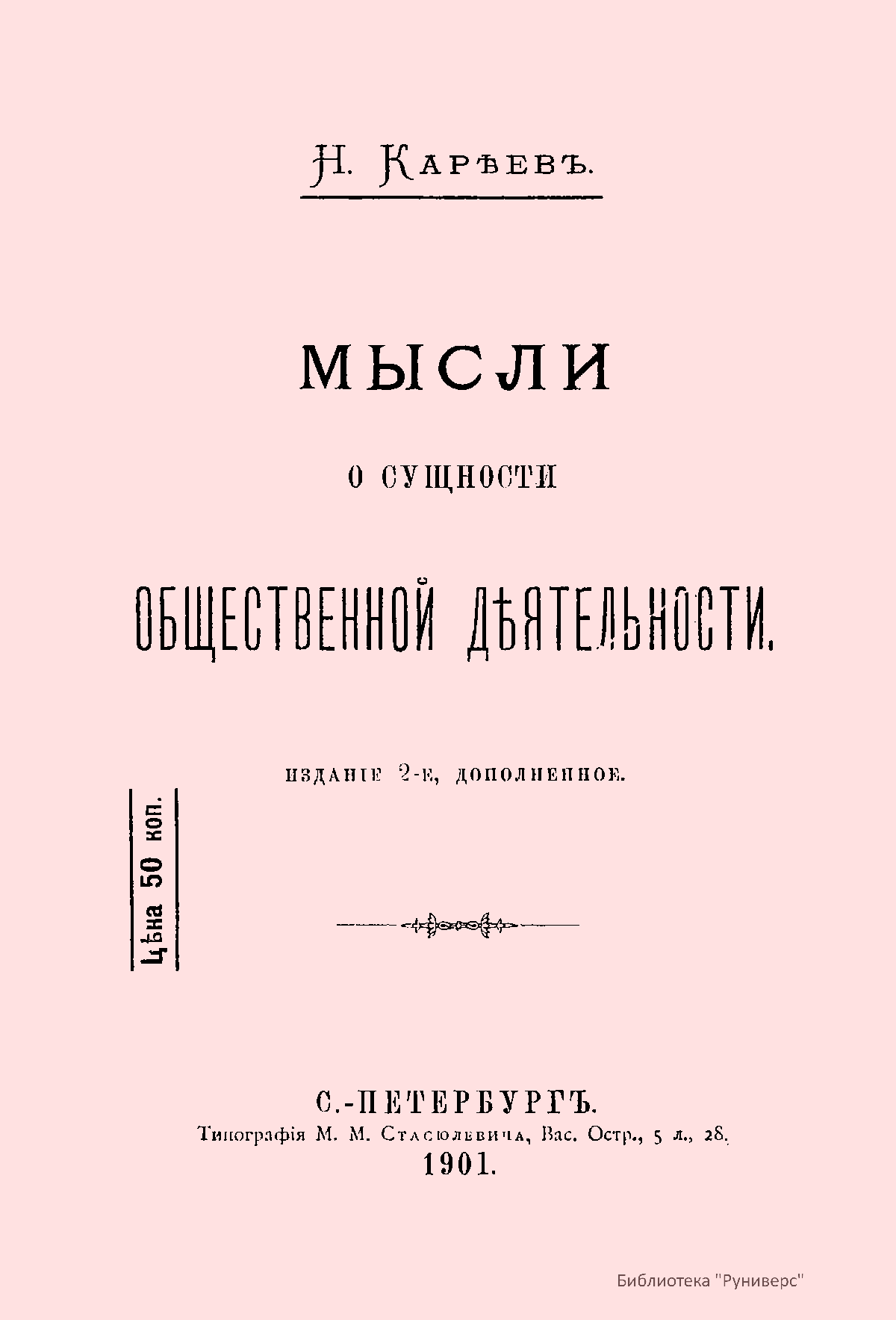Задача этой книги - сделать по отношению к общественной деятельности то, что сделано автором по отношению к нравственной жизни в его работе «Мысли об основах нравственности», которую он начал с вопроса о цели жизни. Личность человека должна быть свободна в выборе своих целей, и это должен помнить каждый общественный деятель, если он сам чувствует себя свободной личностью. Однако если и нельзя навязывать другим свое понимание цели жизни, то из этого не следует, что нельзя доказывать другим неверности их взгляда, когда они ошибаются, и убеждать их в истинности своего, раз в этой истинности сам не сомневаешься.