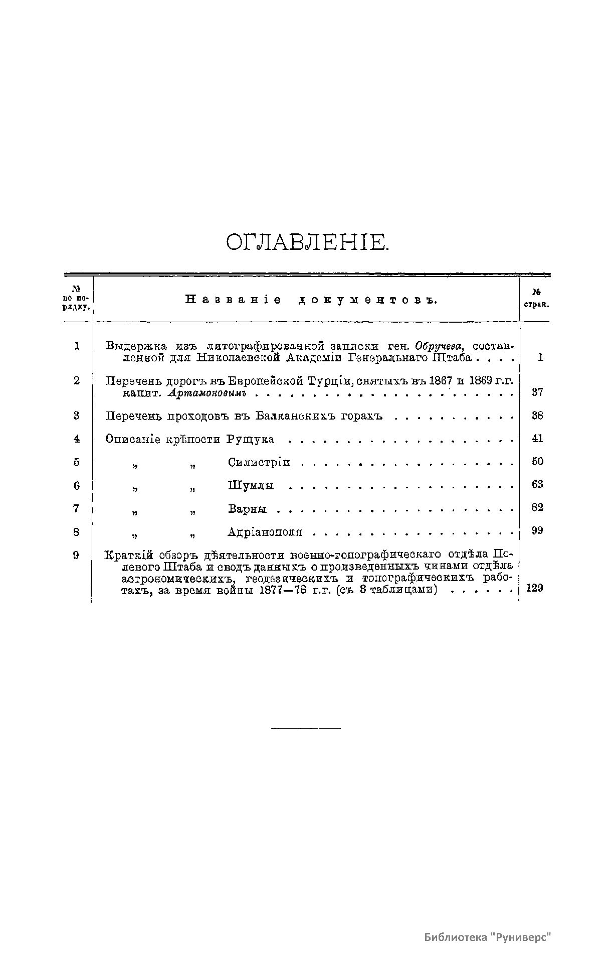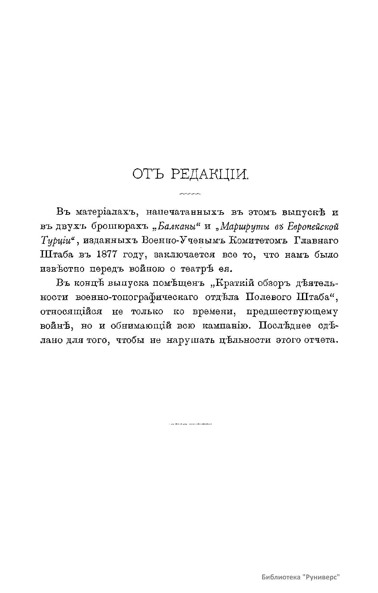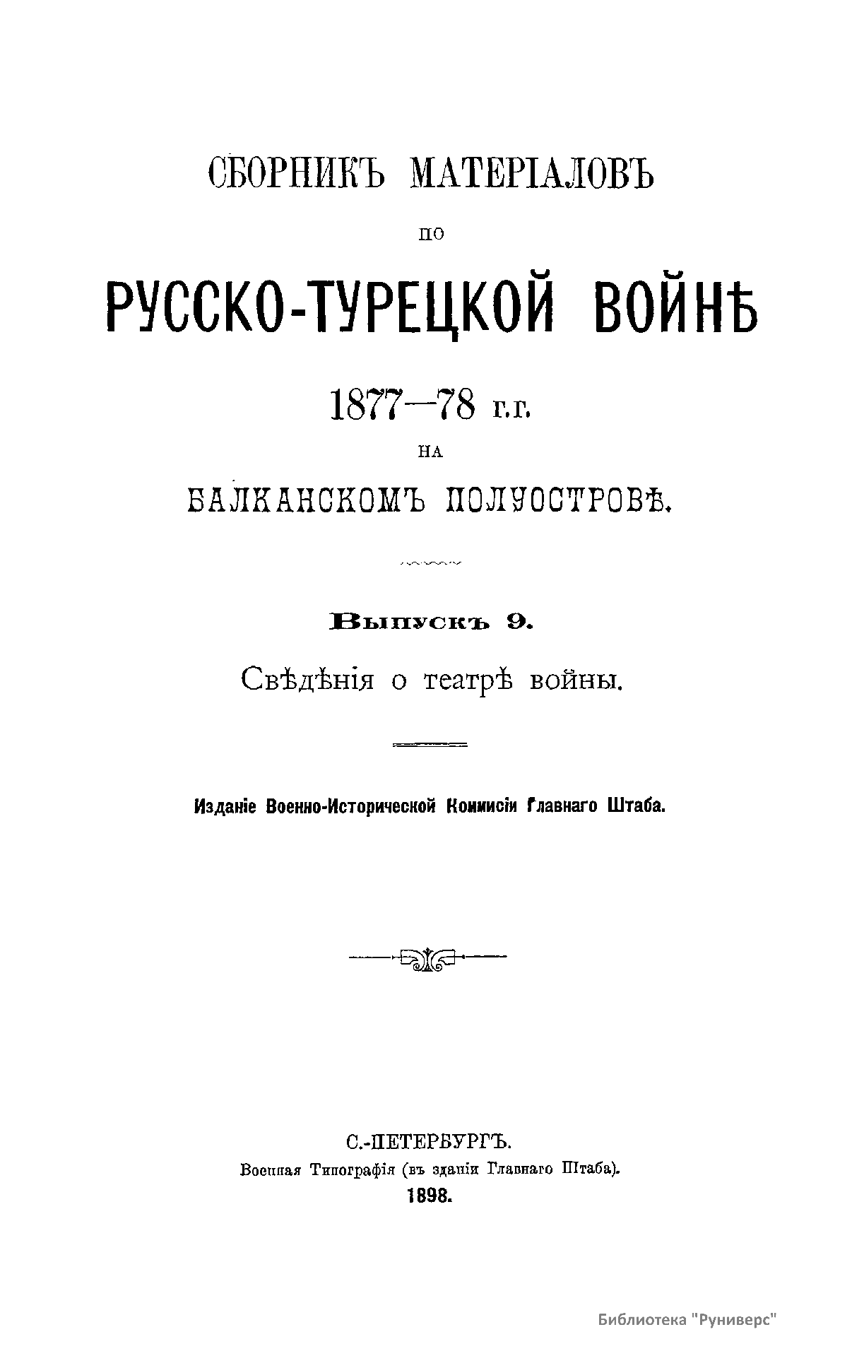 Военно-историческая комиссия Генерального штаба представляет сборник материалов по русско-турецкой войне 1877 – 1878 гг. на Балканском полуострове в 97 выпусках. Издание формирует полное представление о военных действиях и участниках этой войны. Русско-турецкая война 1877 – 1878 гг. была вызвана нежеланием Турции принять меры к улучшению положения подвластных ей христианских княжеств, обусловленному парижским трактатом 1856 г, и стремлением России укрепить свое влияние на Балканах. Способствовала освобождению народов Балканского полуострова от османского владычества. Россия объявила войну Турции 12 апреля 1877 г. Основные события: 1877 – сражение на Шипке, осада и взятие русскими войсками Плевны и Карса; 1878 – зимний переход русской армии через Балканский хребет, победы у Шипки – Шейново, Филиппополя, взятие Адрианополя. Завершилась Сан-Стефанским миром 1878 г., который обеспечил независимость балканским народам и территориальные приобретения России. Но Берлинский трактат ограничил независимость Болгарии и влияние России на Балканах.