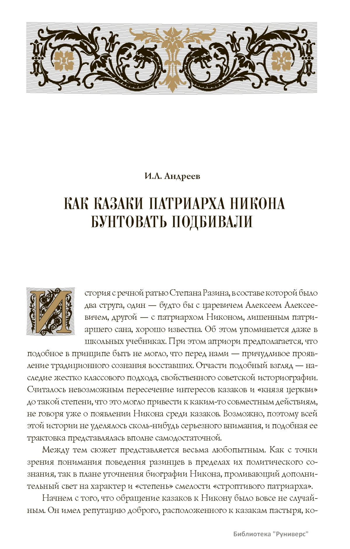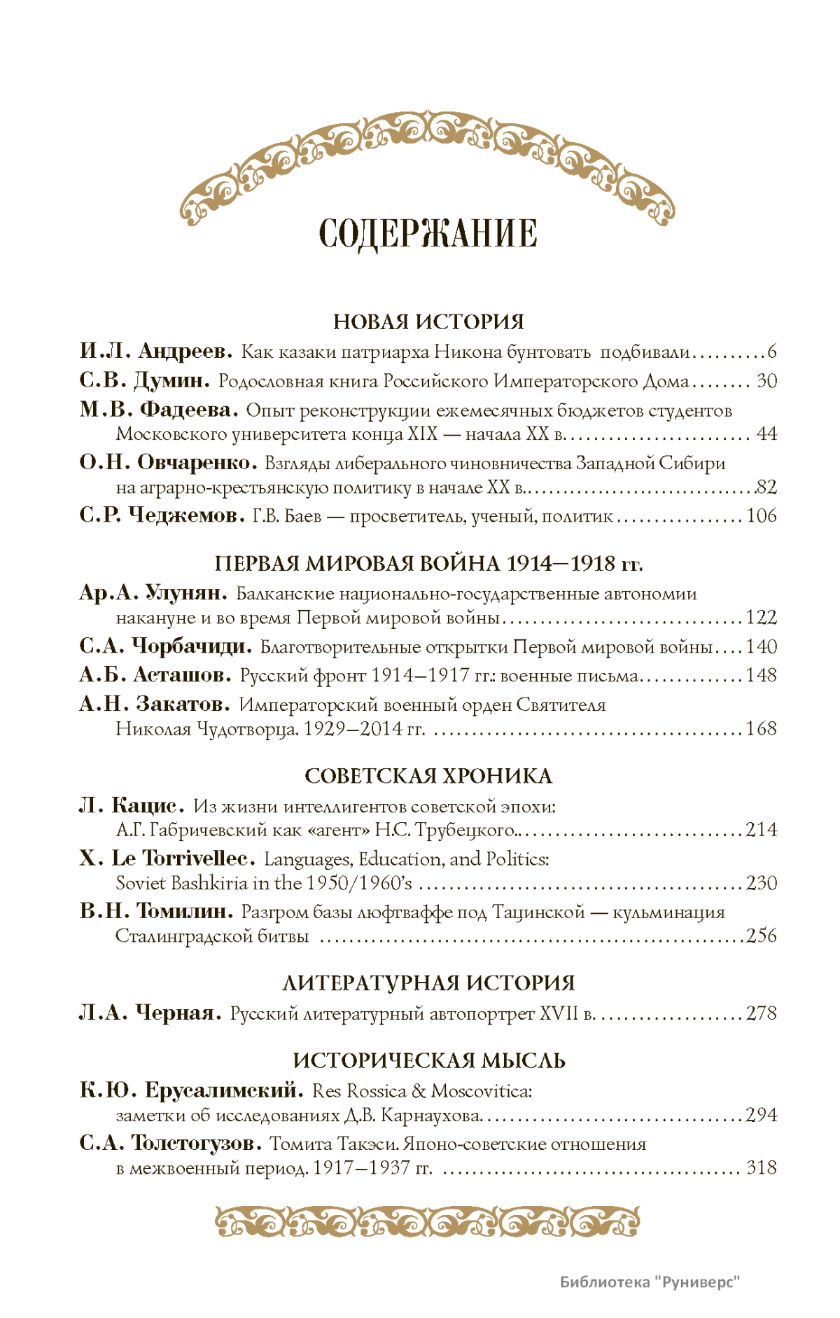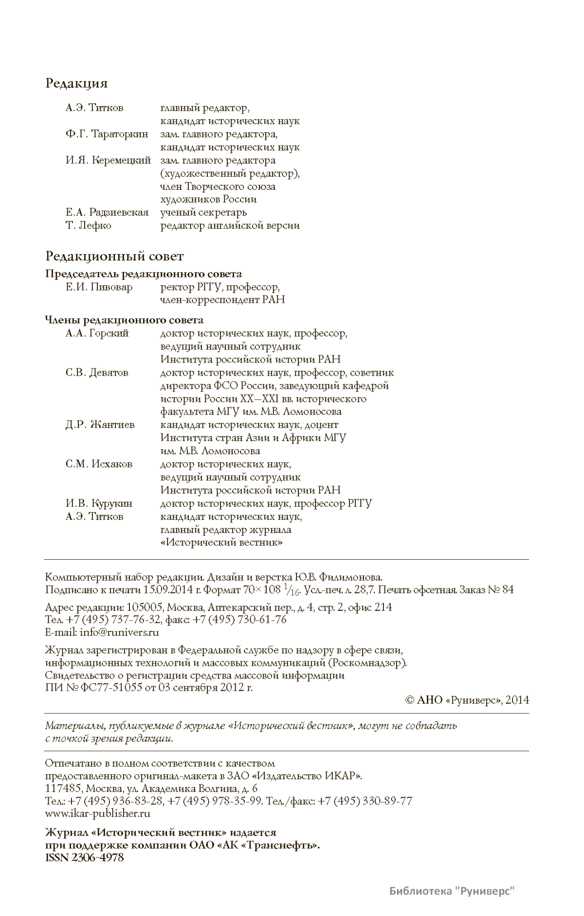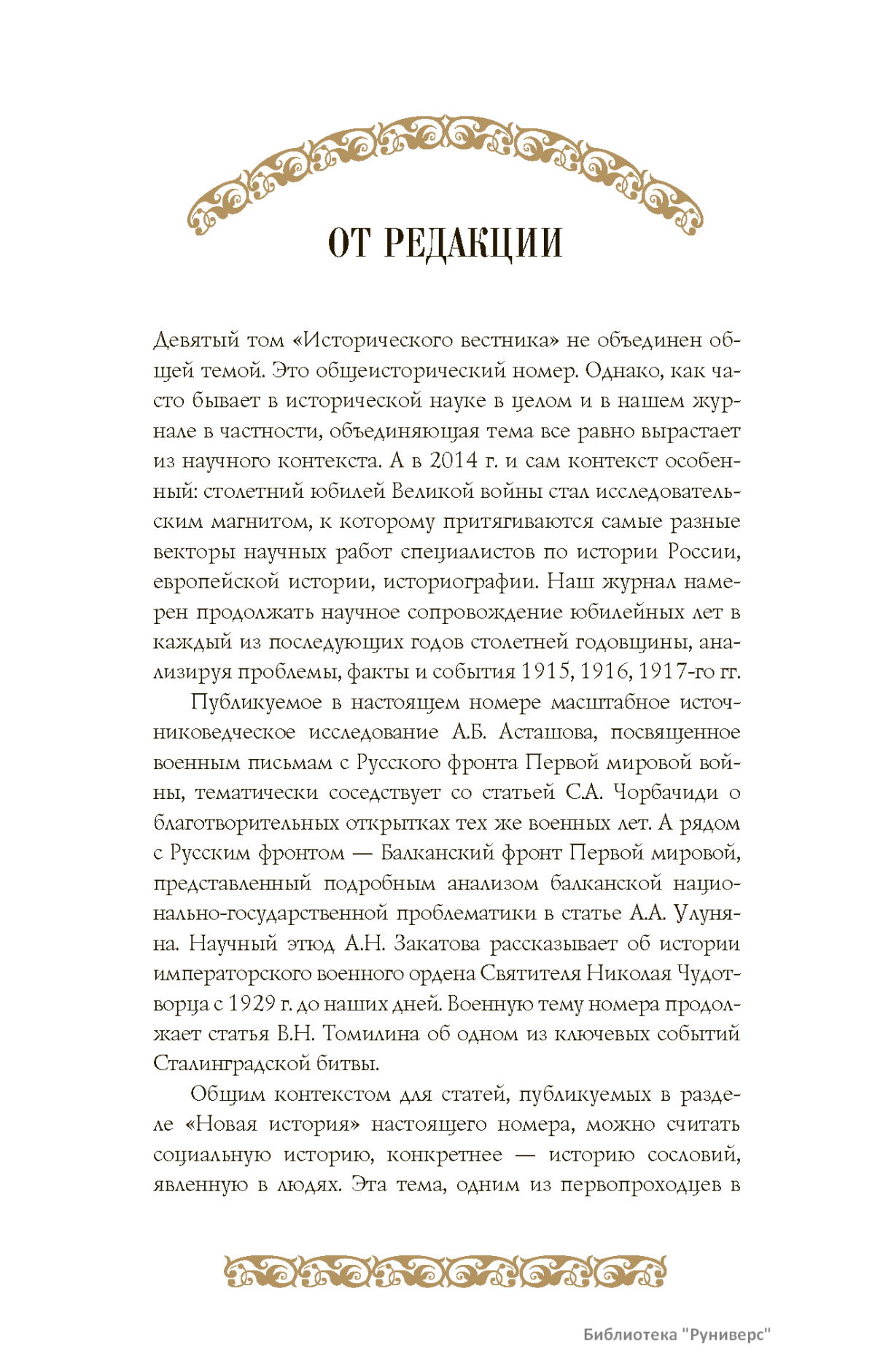 Дорогие коллеги, мы представляем вам первый номер «Исторического вестника», который одновременно обозначается 148-м томом, тем самым продолжая дореволюционное издание. Однако, перешагивая почти сто лет, мы понимаем, что реалии XXI века определяют и новое содержание журнала. История сегодня во многом актуализирована политикой. Именно геополитическая ситуация в мире, возвращающая нас к вопросам сохранения существующих границ, национальных и культурных ценностей, моральных и религиозных принципов, формирует еще одно измерение — проблему аутентичного исторического бытования народов и государств. С одной стороны, это вопрос географических ареалов государственных образований, с другой — тема, связанная с соприкосновением, взаимодействием процессов, культур и традиций. Во многом мы стоим и перед важнейшей этической проблемой. Мы должны не только вежливо и настойчиво указывать нашим уважаемым соседям на свои исторические права, но и сами уходить от искушения искусственного удревнения собственной истории или присвоения чужой. И здесь на сцену выходит его величество Исторический Научный Факт. Он и есть главный цензор и законодатель. На этом незыблемом основании будет строиться редакционная и научная работа «Исторического вестника».