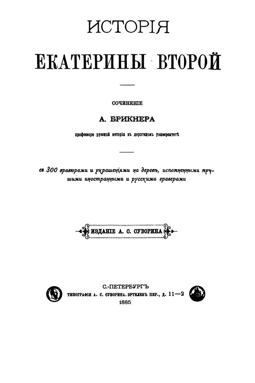 «История Екатерины II» - наиболее крупная из многочисленных работ Брикнера, относящихся к екатерининской эпохе, была также издана сначала в 1883 г. по-немецки в журнале-альманахе В. Онкена «Allgemeine Geschichte» (Всеобщая история), а в 1885 г. – вышла уже в русской переделке, включающей более 300 превосходных гравированных иллюстраций.
