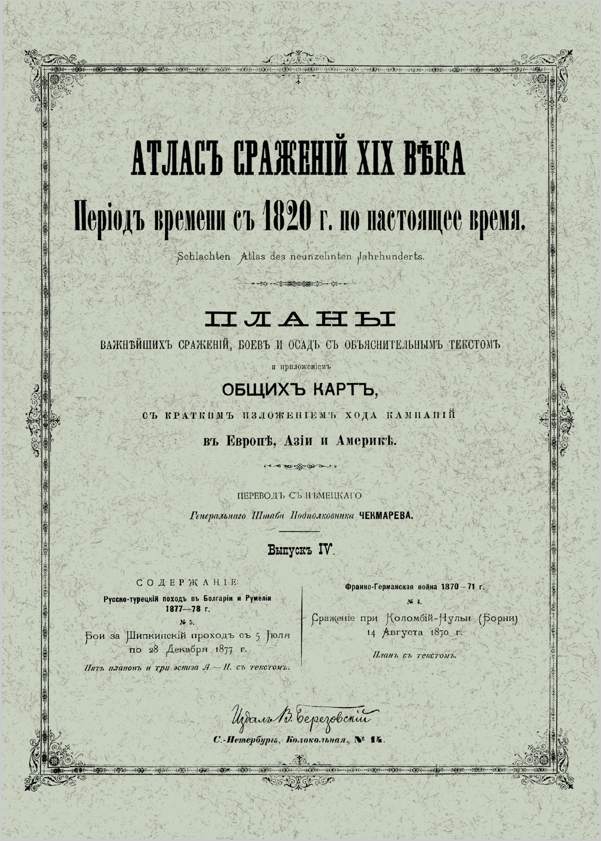 Второе издание «Атласа сражений XIX века» в 20-ти выпусках, представляет собой перевод на русский язык, выпускавшегося в военно-научном комитете Главного штаба на немецком языке с 1830-х гг., разрозненного собрания карт и планов военных кампаний армий мира в XIX века. Переводчиком данного издания является Виктор Иванович Чекмарев (1861–1939) — генерал-лейтенант (1912), видный военный деятель российской императорской армии, историк, участник Первой мировой войны и белого движения на юге России, впоследствии в эмиграции. С 1894 г., занимая должность делопроизводителя, а затем столоначальника канцелярии военно-ученого комитета Главного Штаба, подполковник Генерального Штаба Чекмарев, в результате кропотливой работы собрал воедино «Атлас сражений XIX века», каждый выпуск которого посвящен одной или нескольким военным кампаниям Европы, Азии и Америки, содержит подробное описание расположения войск и хода боевых действий противников, хронологию событий, снабжен картами и планами сражений. Это издание имеет большую историко-культурную ценность, интересно как ученым-историкам, так и любителям военно-исторической литературы.