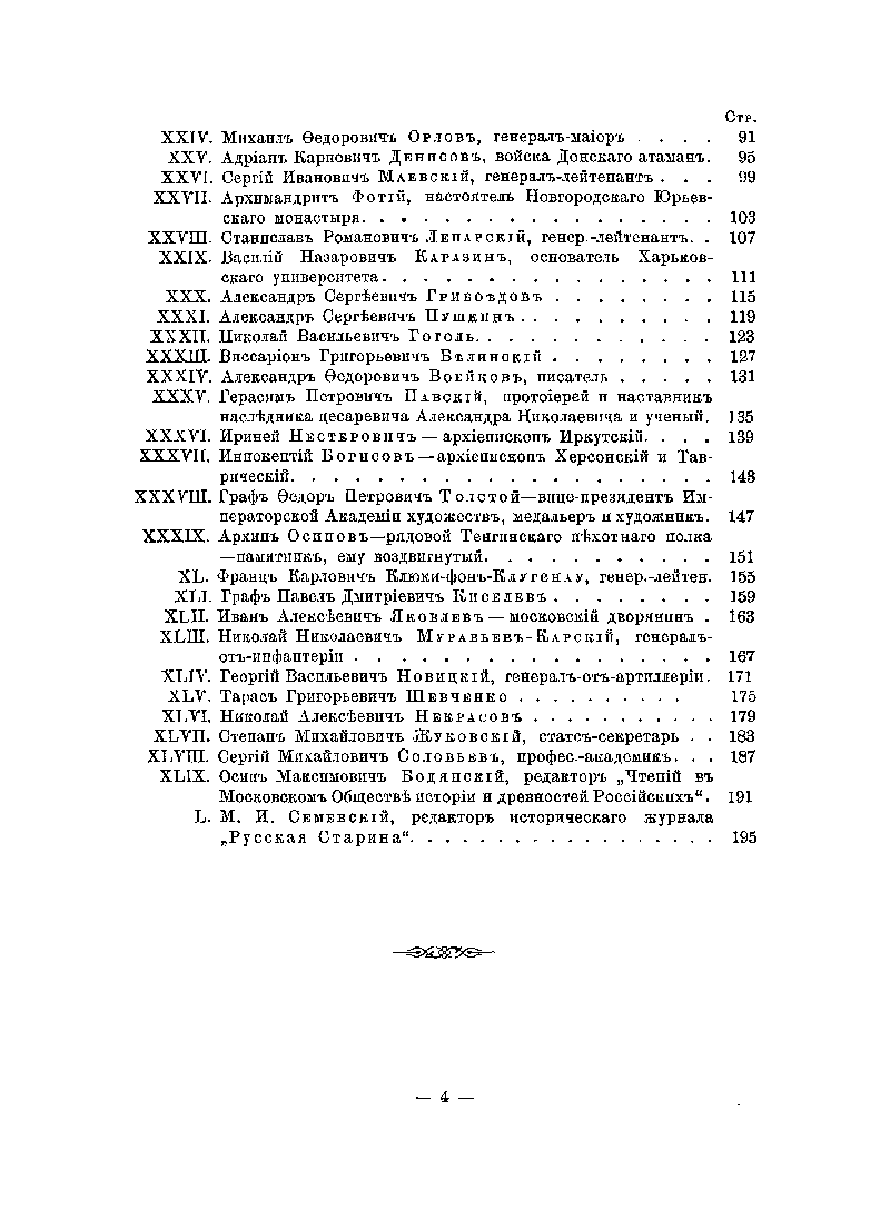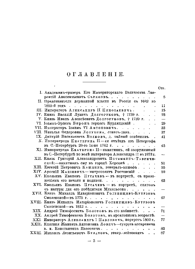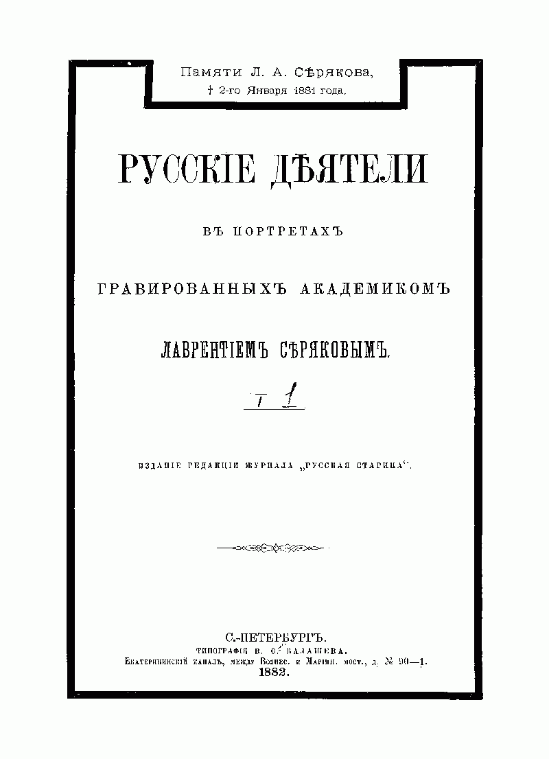 В 1882 г . коллектив исторического журнала «Русская старина», издававшегося в Санкт-Петербурге Михаилом Семевским, впервые соединил в отдельный сборник некоторые из портретов выдающихся русских деятелей, выгравированных знаменитыми русскими граверами. Издание имело большой успех у читателей и было переиздано в 1886 г. Портреты сопровождаются биографическими очерками, составленными, по большей части, по материалам «Русской Старины». Все биографии составлены полно и обстоятельно. Сборник повествует о высокопоставленных особах, историках, священнослужителях, писателях, генералах, композиторах, певцах – блестящих представителях своей эпохи от святого князя Владимира до Муравьева-Апостола и Бестужева. Биографические заметки и очерки, сопровождающие портреты третьего издания, были составлены постоянной (с 1874 г.) сотрудницей «Русской старины» В. В. Тимощук.