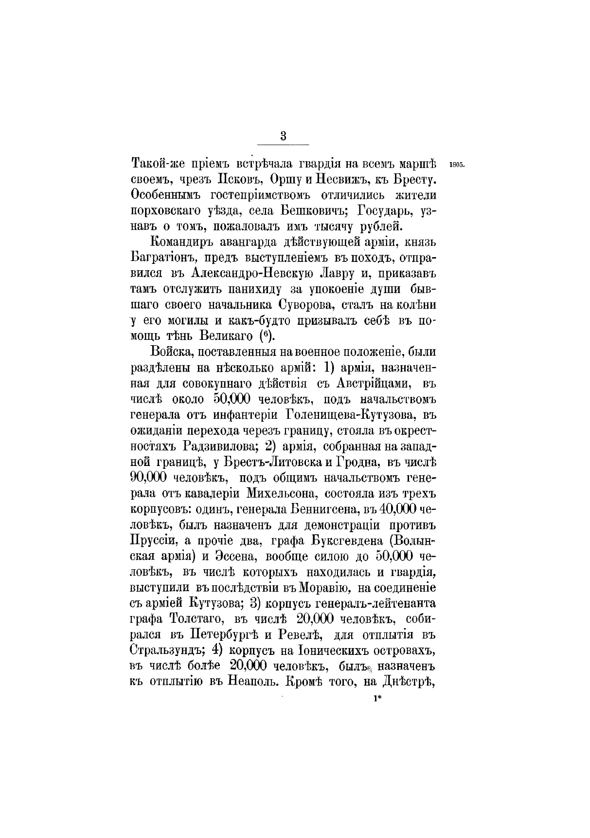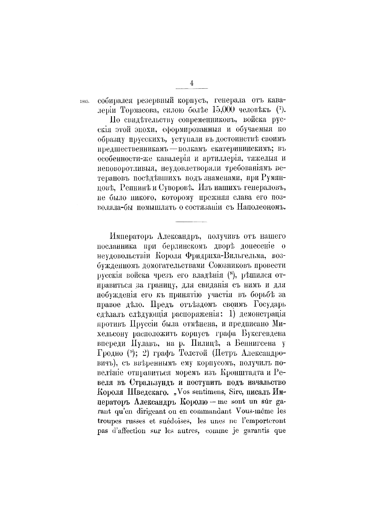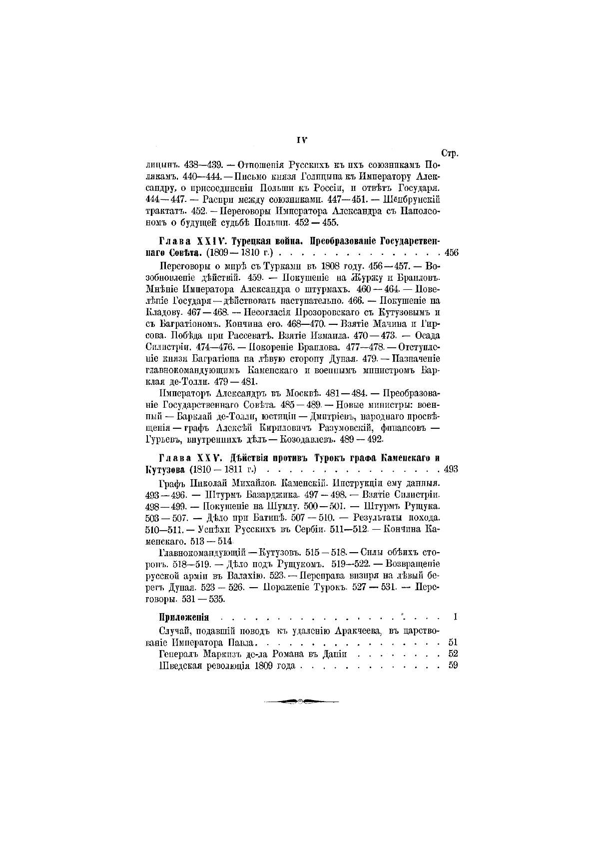 «История царствования императора Александра I и России в его время» вышла в свет в 1869–1871 гг. Ее автор, Богданович Модест Иванович (1805–1882), — генерал-лейтенант, военный писатель. В 1831 г. участвовал в сражениях под Вавром, Гроховым, Дембе-Вельке и Рагозиным. Пройдя курс в военной академии, занял в ней кафедру военной истории и стратегии, был членом Военного совета, официальным военным историографом. Оставил после себя множество военно-исторических и исторических трудов, в которых интересуется, главным образом, политической историей; его попытки критически отнестись к создавшимся легендам были встречены официальными историками весьма недоброжелательно. Повествование разделено на две части: первая, заключающаяся в I–IV томах, охватывает события 1801–1815 гг.; вторая — V, VI тома — содержит исторический период после 1815 г. до кончины Александра I в 1825 г. При создании книги Богданович использовал сведения из государственных архивов, а также до того не издававшиеся документы: бумаги императора Александра I, графа П. А. Строганова, записки адмирала А. С. Шишкова, журнал морских походов Д. Н. Сенявина и др. Полный список источников, печатных книг и рукописей, приведен в конце шестого тома. Богатый фактический материал иллюстрируют карты театров военных действий и планы главных сражений.