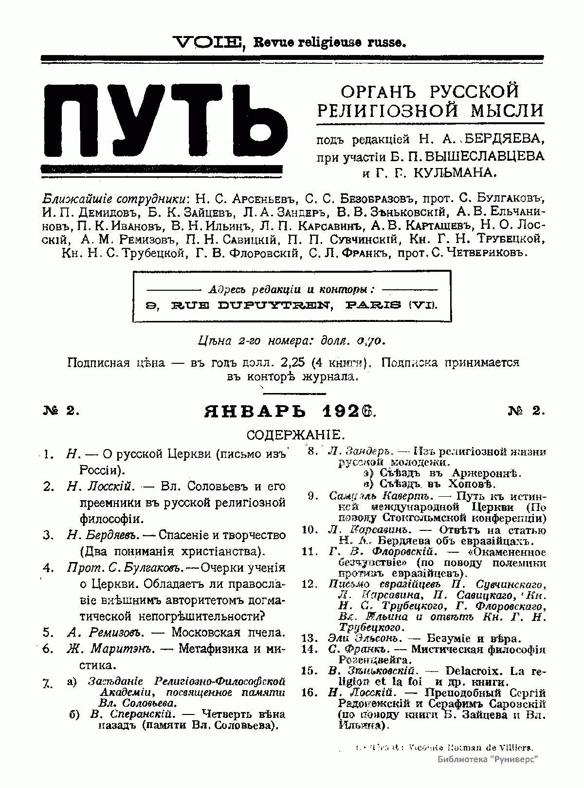 Путь: Орган русской религиозной мысли. №2. Январь 1926