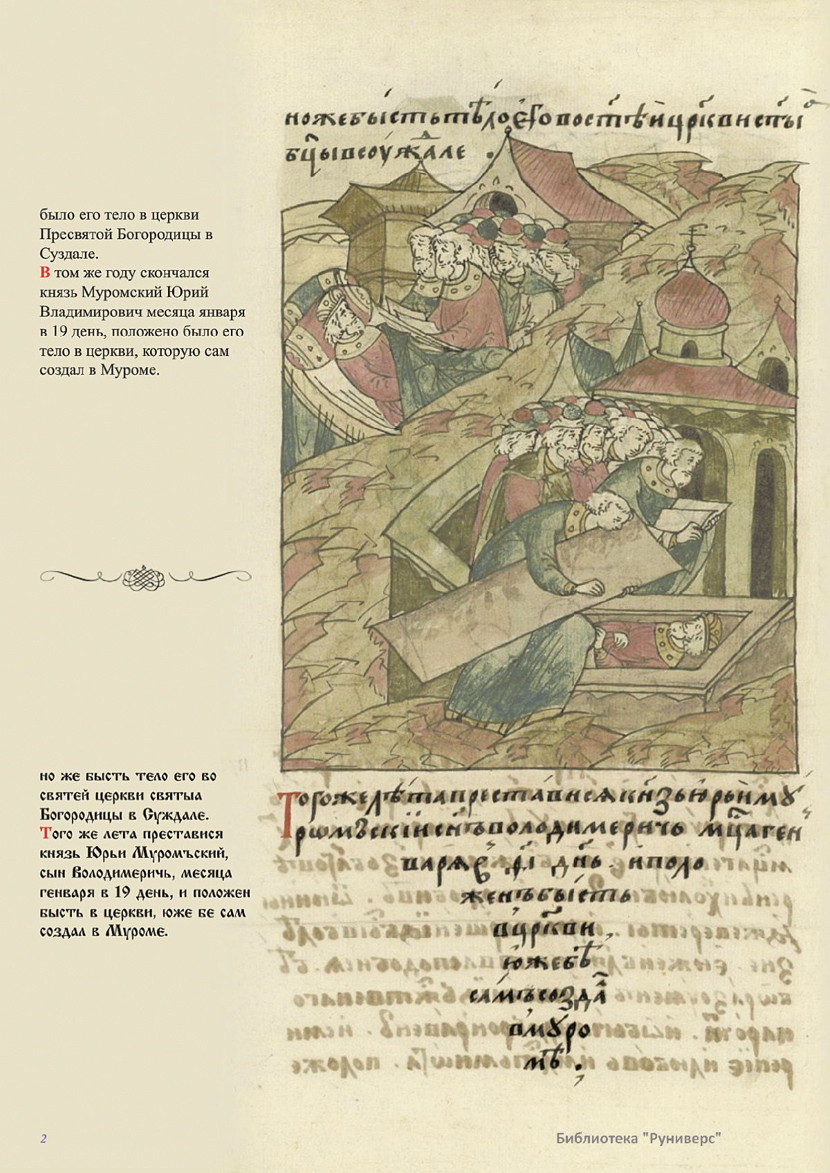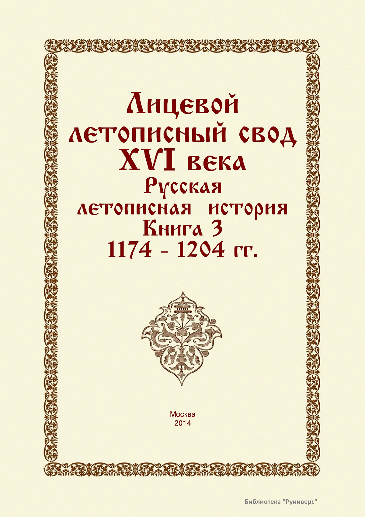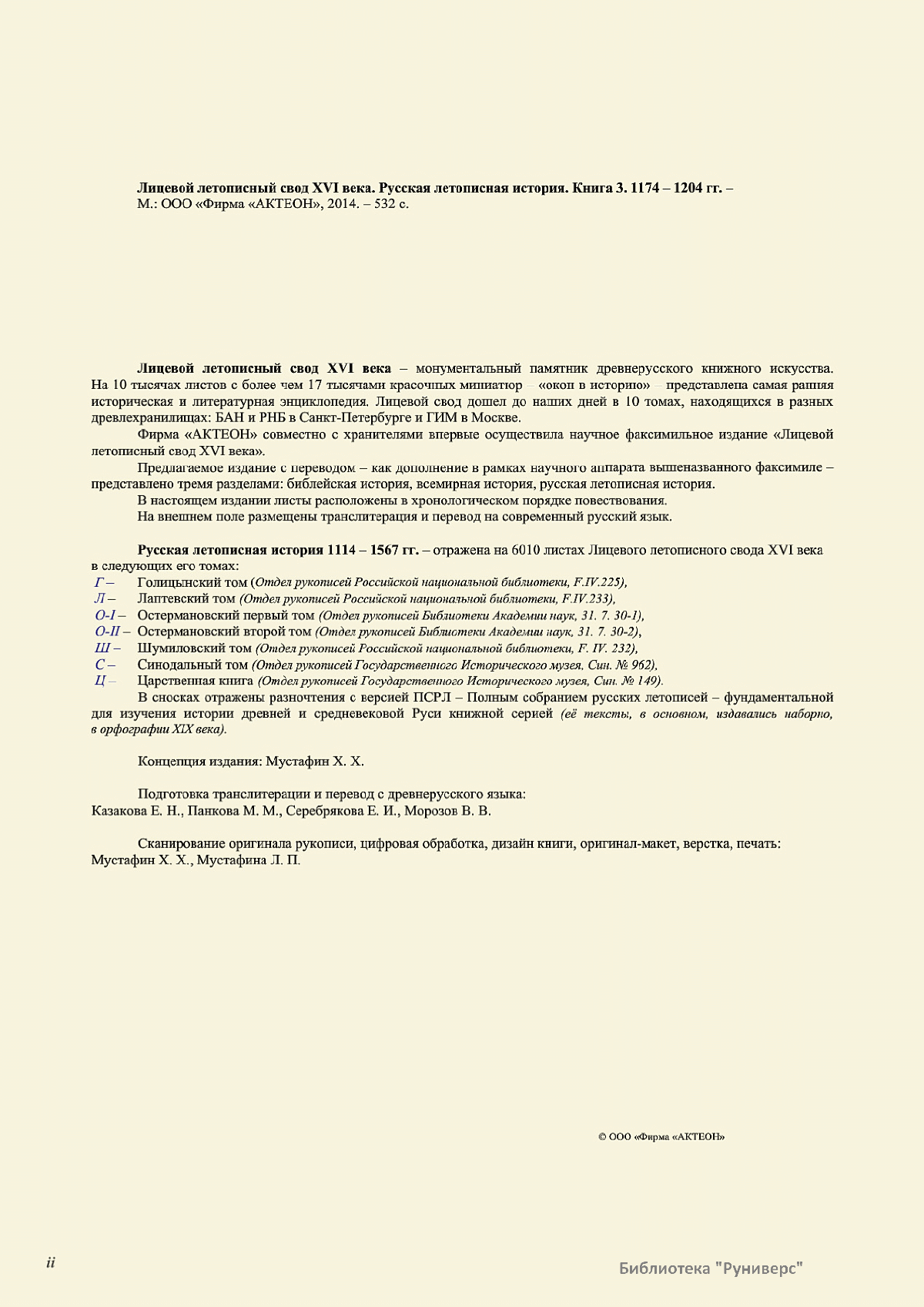 Лицевой летописный свод. XVI века — монументальный памятник древнерусского книжного искусства. На 10 тысячах листов с более чем 17 тысячами красочных миниатюр — «окон в историю» — представлена самая ранняя историческая и литературная энциклопедия. Лицевой свод дошел до наших дней в 10 томах, находящихся в разных древлехранилищах: БАН к РНБ в Санкт-Петербурге и ГИМ в Москве. Фирма «АКТЕОН» совместно с хранителями впервые осуществила научное факсимильное издание «Лицевой летописный свод XVI века». Предлагаемое издание с переводом — как дополнение в рамках научного аппарата вышеназванного факсимиле - представлено тремя разделами: библейская история, всемирная история, русская летописная история. В настоящем издании листы расположены в хронологическом порядке повествования На внешнем поле размещены транслитерация и перевод на современный русский язык. Русская летописная история 1114—1567 гг. — отражена на 6010 Лицевого летописного свода XVI века в следующих его томах: Г — Голицынский том (Отдел рукописей Российский национальной библиотеки, F.IV.225), Л — Лаптевский TOM (Отдел рукописей Российской национальной библиотеки, F.IV.233), O-I — Остермановский первый том (Отдел рукописей Библиотеки Академии наук, 31. 7. 30-1), O-II — Остермановский второй той (Отдел рукописей Библиотеки Академии наук, 31, 7. 30-2), Ш — Шумиловский том (Отдел рукописей Российской национальной библиотеки, F, IY. 232), С — Синодальный том (Отдел рукописей Государственного Исторического музея. Син. № 962), Ц— Царственная книга (Отдел рукописей Государственного Историческою музея. Син. № 149). В сносках отряжены разночтения с перепей ПСРЛ — Полным собранием русских летописей - фундаментальной для изучения истории древней и средневековой Руси книжной серией (её тексты, в основном, издавались наборно, в орфографии XIX века).
