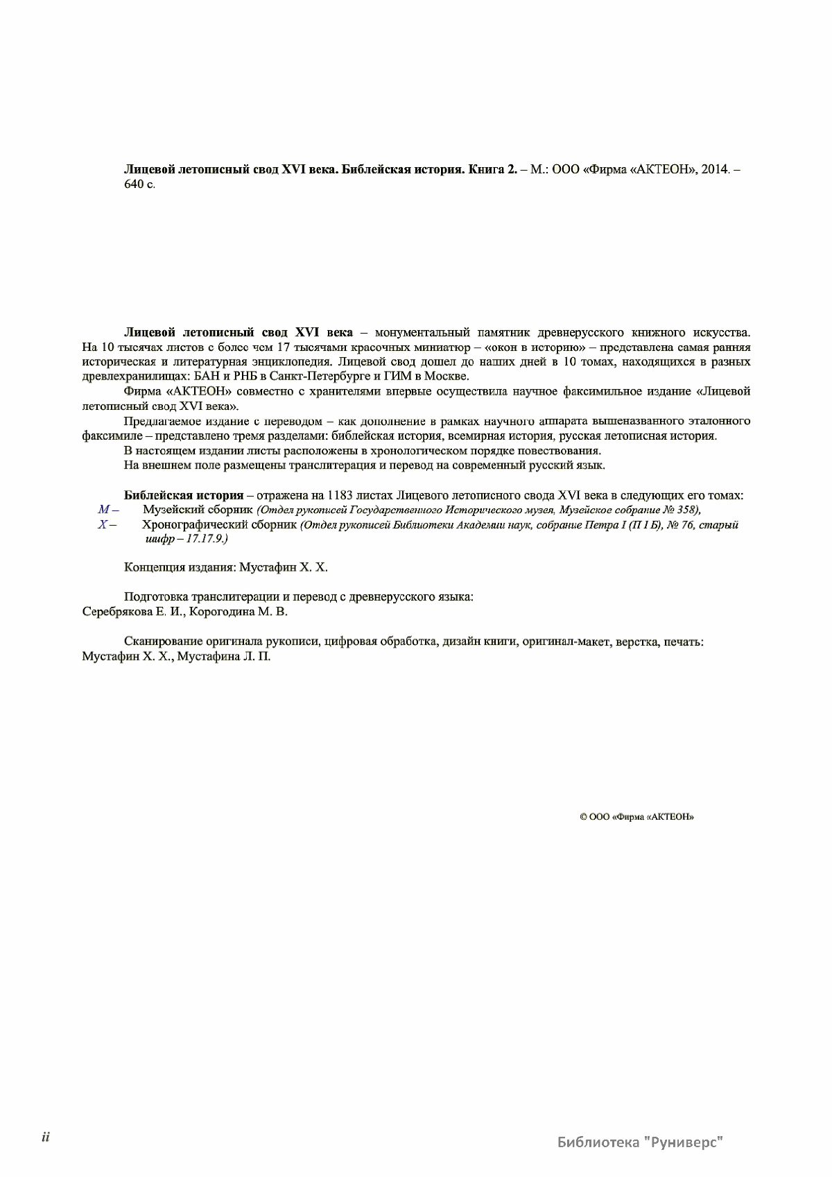 Лицевой летописный свод. XVI века — монументальный памятник древнерусского книжного искусства. На 10 тысячах листов с более чем 17 тысячами красочных миниатюр — «окон в историю» — представлена самая ранняя историческая и литературная энциклопедия. Лицевой свод дошел до наших дней в 10 томах, находящихся в разных древлехранилищах: БАН к РНБ в Санкт-Петербурге и ГИМ в Москве. Фирма «АКТЕОН» совместно с хранителями впервые осуществила научное факсимильное издание «Лицевой летописный свод XVI века». Предлагаемое издание с переводом — как дополнение в рамках научного аппарата вышеназванного факсимиле - представлено тремя разделами: библейская история, всемирная история, русская летописная история. В настоящем издании листы расположены в хронологическом порядке повествования На внешнем поле размещены транслитерация и перевод на современный русский язык. Русская летописная история 1114—1567 гг. — отражена на 6010 Лицевого летописного свода XVI века в следующих его томах: Г — Голицынский том (Отдел рукописей Российский национальной библиотеки, F.IV.225), Л — Лаптевский TOM (Отдел рукописей Российской национальной библиотеки, F.IV.233), O-I — Остермановский первый том (Отдел рукописей Библиотеки Академии наук, 31. 7. 30-1), O-II — Остермановский второй той (Отдел рукописей Библиотеки Академии наук, 31, 7. 30-2), Ш — Шумиловский том (Отдел рукописей Российской национальной библиотеки, F, IY. 232), С — Синодальный том (Отдел рукописей Государственного Исторического музея. Син. № 962), Ц— Царственная книга (Отдел рукописей Государственного Историческою музея. Син. № 149). В сносках отряжены разночтения с перепей ПСРЛ — Полным собранием русских летописей - фундаментальной для изучения истории древней и средневековой Руси книжной серией (её тексты, в основном, издавались наборно, в орфографии XIX века).