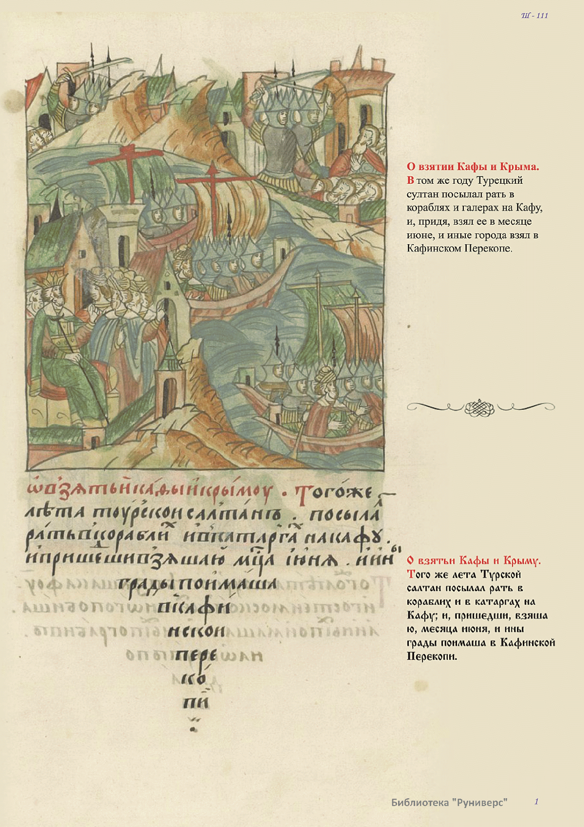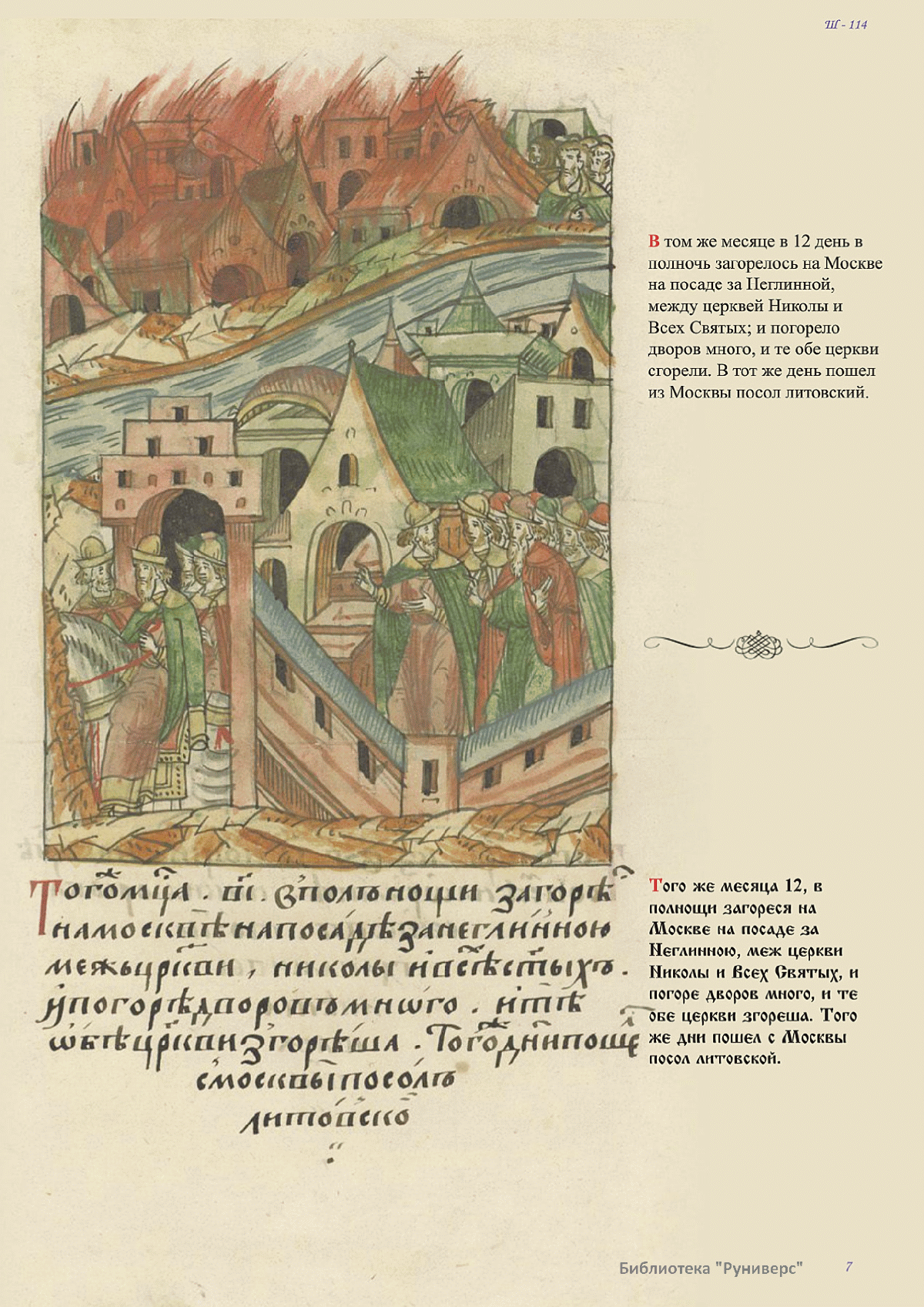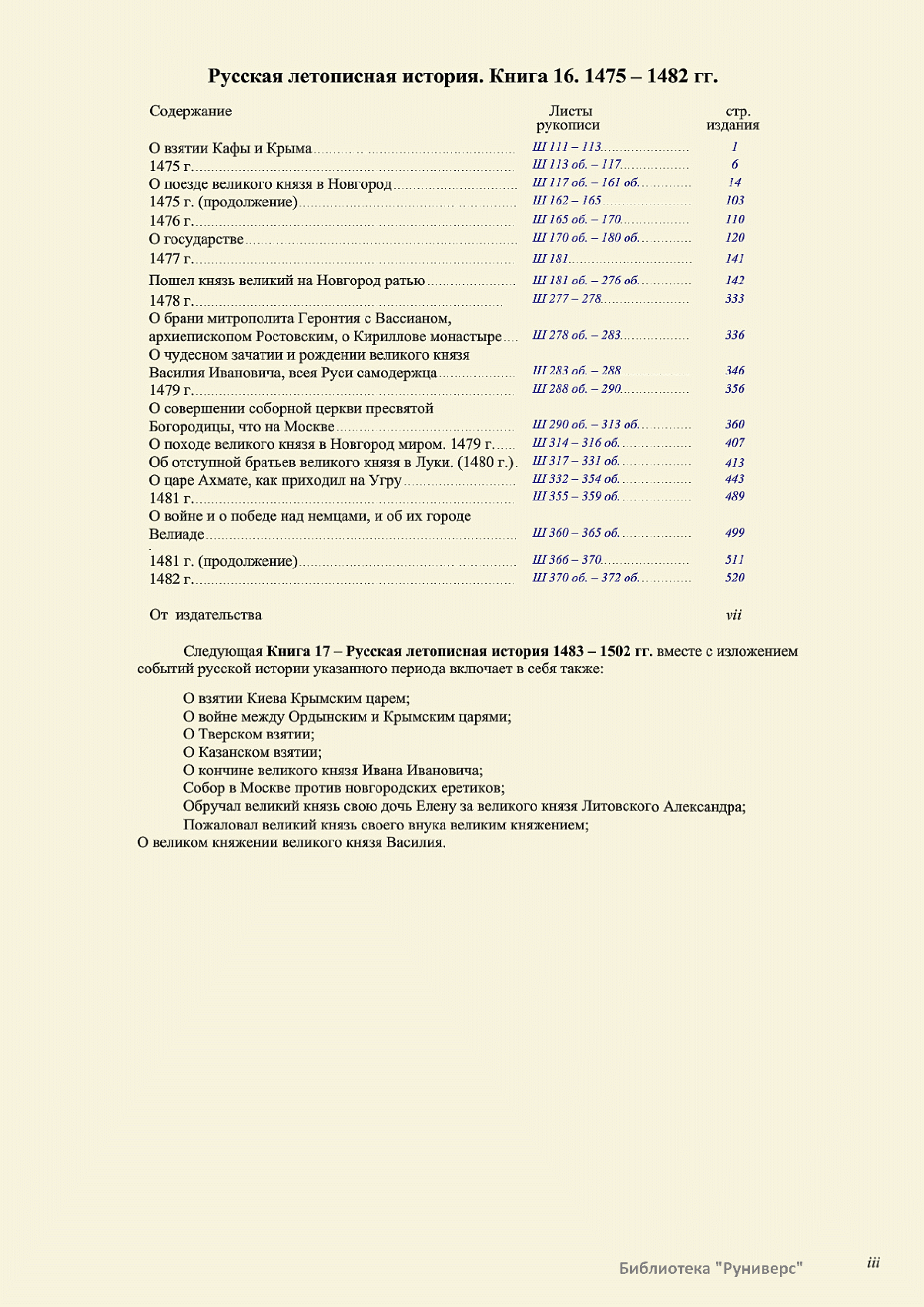 Лицевой летописный свод. XVI века — монументальный памятник древнерусского книжного искусства. На 10 тысячах листов с более чем 17 тысячами красочных миниатюр — «окон в историю» — представлена самая ранняя историческая и литературная энциклопедия. Лицевой свод дошел до наших дней в 10 томах, находящихся в разных древлехранилищах: БАН к РНБ в Санкт-Петербурге и ГИМ в Москве. Фирма «АКТЕОН» совместно с хранителями впервые осуществила научное факсимильное издание «Лицевой летописный свод XVI века». Предлагаемое издание с переводом — как дополнение в рамках научного аппарата вышеназванного факсимиле - представлено тремя разделами: библейская история, всемирная история, русская летописная история. В настоящем издании листы расположены в хронологическом порядке повествования На внешнем поле размещены транслитерация и перевод на современный русский язык. Русская летописная история 1114—1567 гг. — отражена на 6010 Лицевого летописного свода XVI века в следующих его томах: Г — Голицынский том (Отдел рукописей Российский национальной библиотеки, F.IV.225), Л — Лаптевский TOM (Отдел рукописей Российской национальной библиотеки, F.IV.233), O-I — Остермановский первый том (Отдел рукописей Библиотеки Академии наук, 31. 7. 30-1), O-II — Остермановский второй той (Отдел рукописей Библиотеки Академии наук, 31, 7. 30-2), Ш — Шумиловский том (Отдел рукописей Российской национальной библиотеки, F, IY. 232), С — Синодальный том (Отдел рукописей Государственного Исторического музея. Син. № 962), Ц— Царственная книга (Отдел рукописей Государственного Историческою музея. Син. № 149). В сносках отряжены разночтения с перепей ПСРЛ — Полным собранием русских летописей - фундаментальной для изучения истории древней и средневековой Руси книжной серией (её тексты, в основном, издавались наборно, в орфографии XIX века).