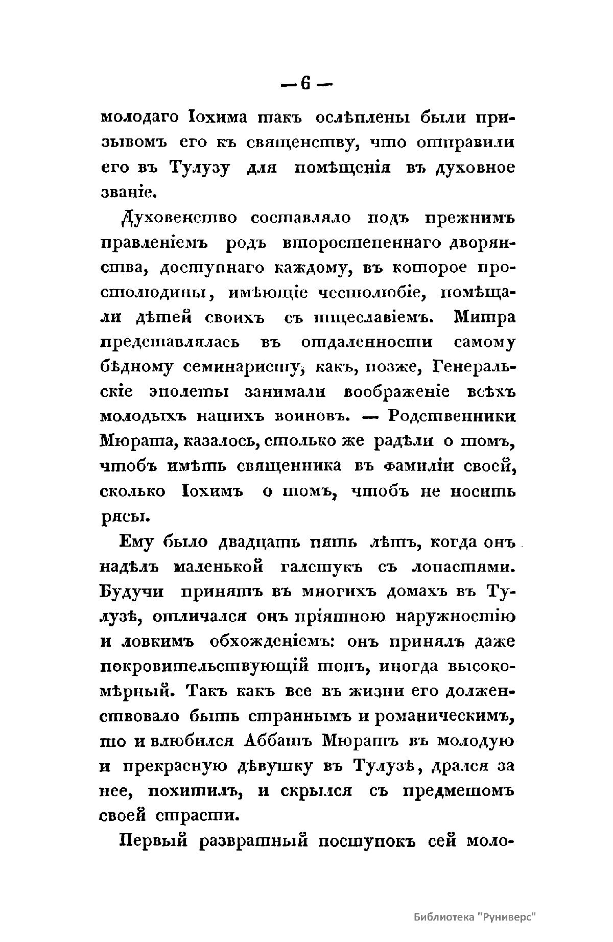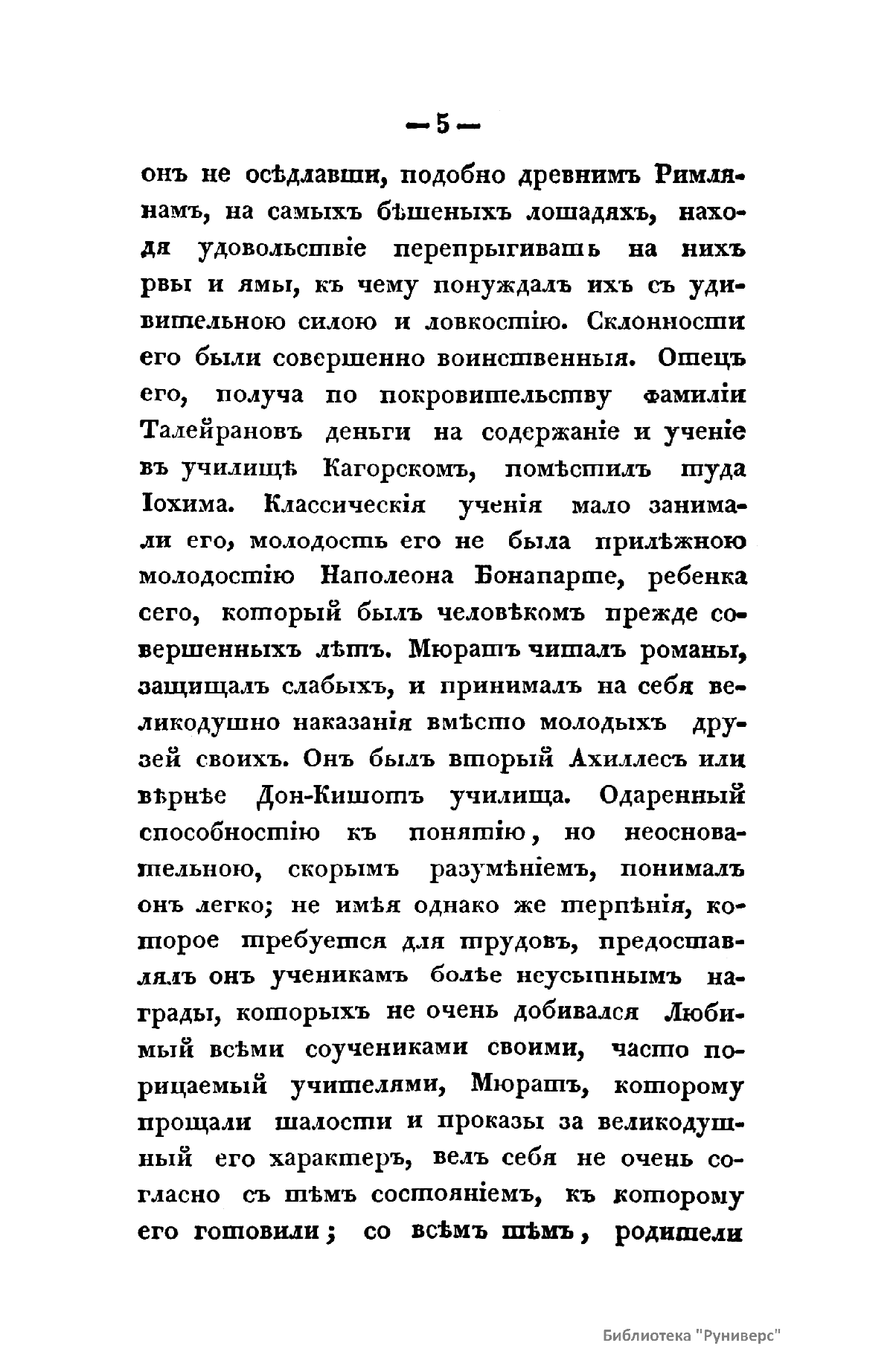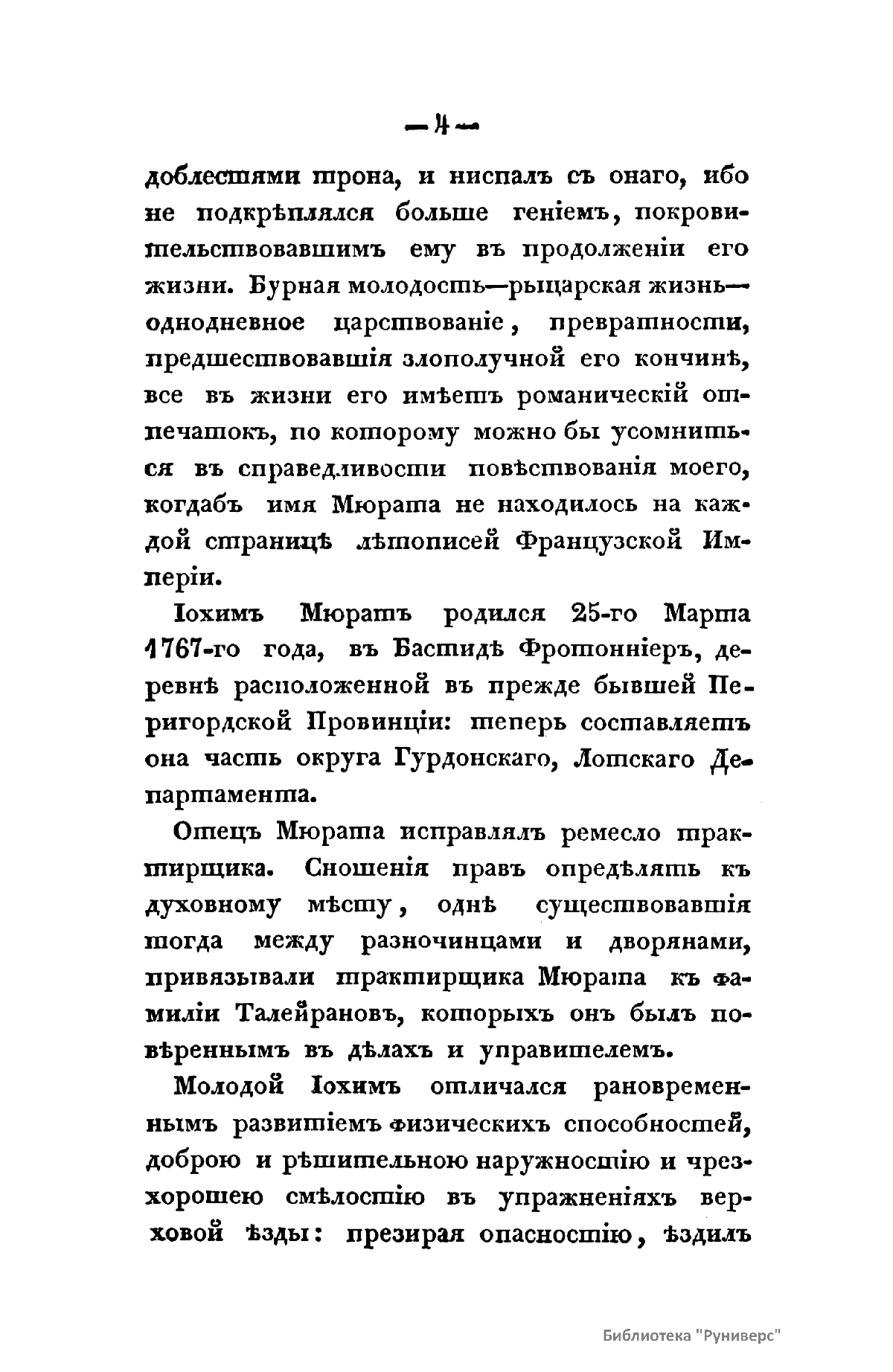 «История Иохима Мюрата, зятя Наполеонова, бывшаго короля Неаполитанскаго» Л.-Ш. Галлуа вышла в свет в России в 1830 г., через почти двадцать лет после событий Отечественной войны 1812 г. Автор книги был установлен по парижскому изданию 1828 г. Современник Мюрата, Галлуа собрал и обработал интересный материал, касающийся как непосредственно биографии знаменитого маршала, так и наполеоновской эпохи в целом. Сын трактирщика, ученик духовной семинарии, Иоахим Мюрат сделал блестящую карьеру военного и политического деятеля. Получил звание маршала Франции, корону Неаполитанского королевства, титул герцога Бергского, Великого адмирала, принца империи. Был женат на сестре Бонапарта Каролине. Мюрат принимал участие практически во всех военных кампаниях и крупных сражениях наполеоновских войн, проявив себя талантливым военачальником. Во время войны с Россией был назначен командующим кавалерией французской армии, лично водил в атаку кирасиров на укрепления русских войск в Бородинской битве, в сражении при Тарутино Мюрату удалось спасти остатки французской армии и выйти из окружения противника.