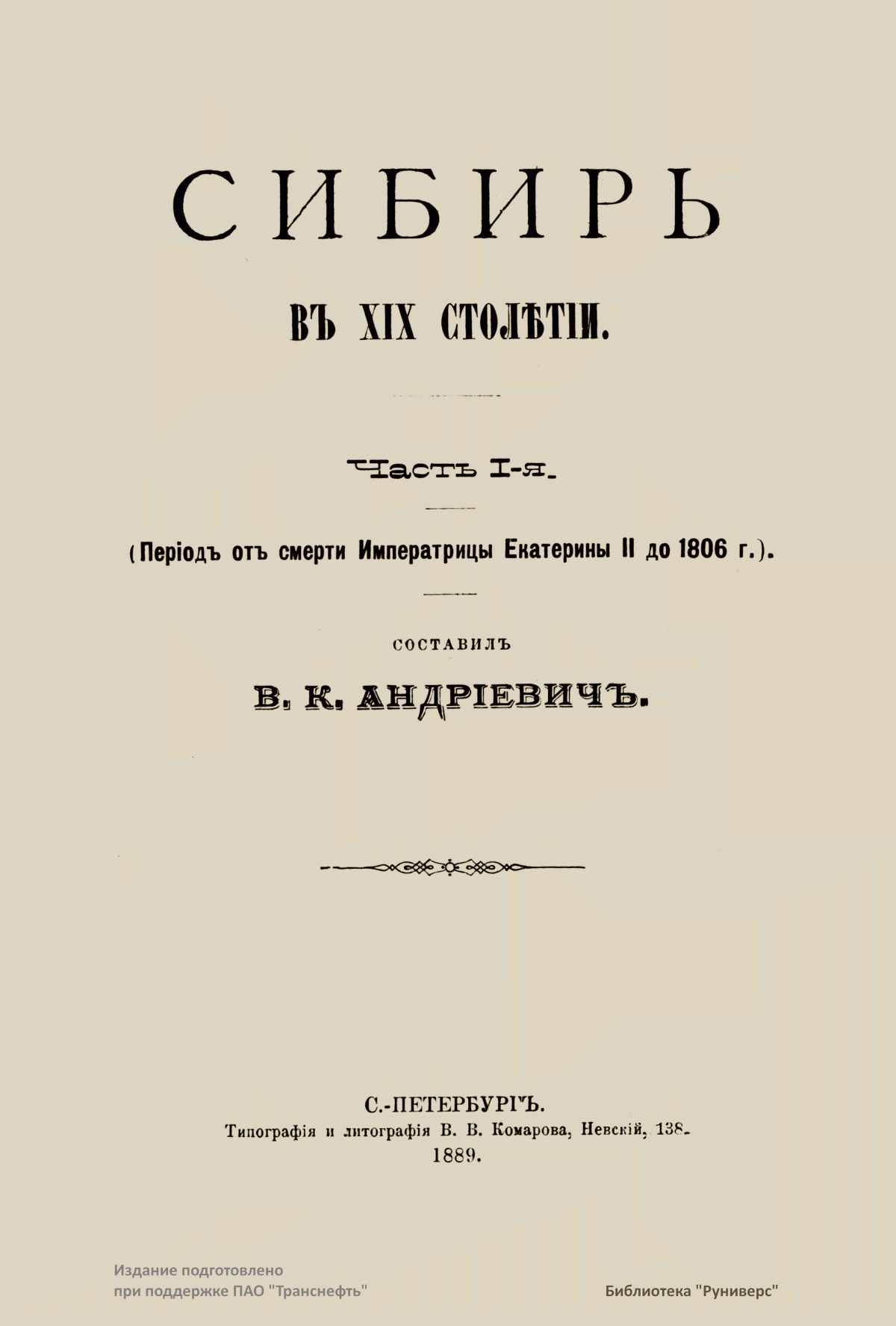 Исследователь В. К. Андриевич в своей работе «Сибирь в XIX столетии» описал географические и природно-климатические условия Сибири, ее хозяйственное и промышленное освоение, быт и культуру инородцев. Анализируя систему управления в Сибири в XIX столетии, он рассматривал вопросы становления в регионе организационных структур полицейского ведомства. По его словам, «на губернаторов были возложены чрезмерные полномочия, что способствовало развитию губернаторского произвола». Но, вместе с тем, автор дал положительную характеристику таким генерал-губернаторам, как Сперанский, Муравьев, Корсаков, Синельников, Анучин. Его работа заложила основы критического осмысления опыта освоения и управления Сибири. Залог успешного развития этого края он видел в его природном богатстве, имея в виду обилие пушного зверя, леса и золота. В исследовании приведены подробные статистические данные. Источниками служили Полное собрание законов Российской империи, архивы: Сената, Каратузской станицы Минусинского округа, Красноярской городской управы, рукописи из библиотеки Минусинского музея, документы из библиотеки Енисейского музея, периодические издания.