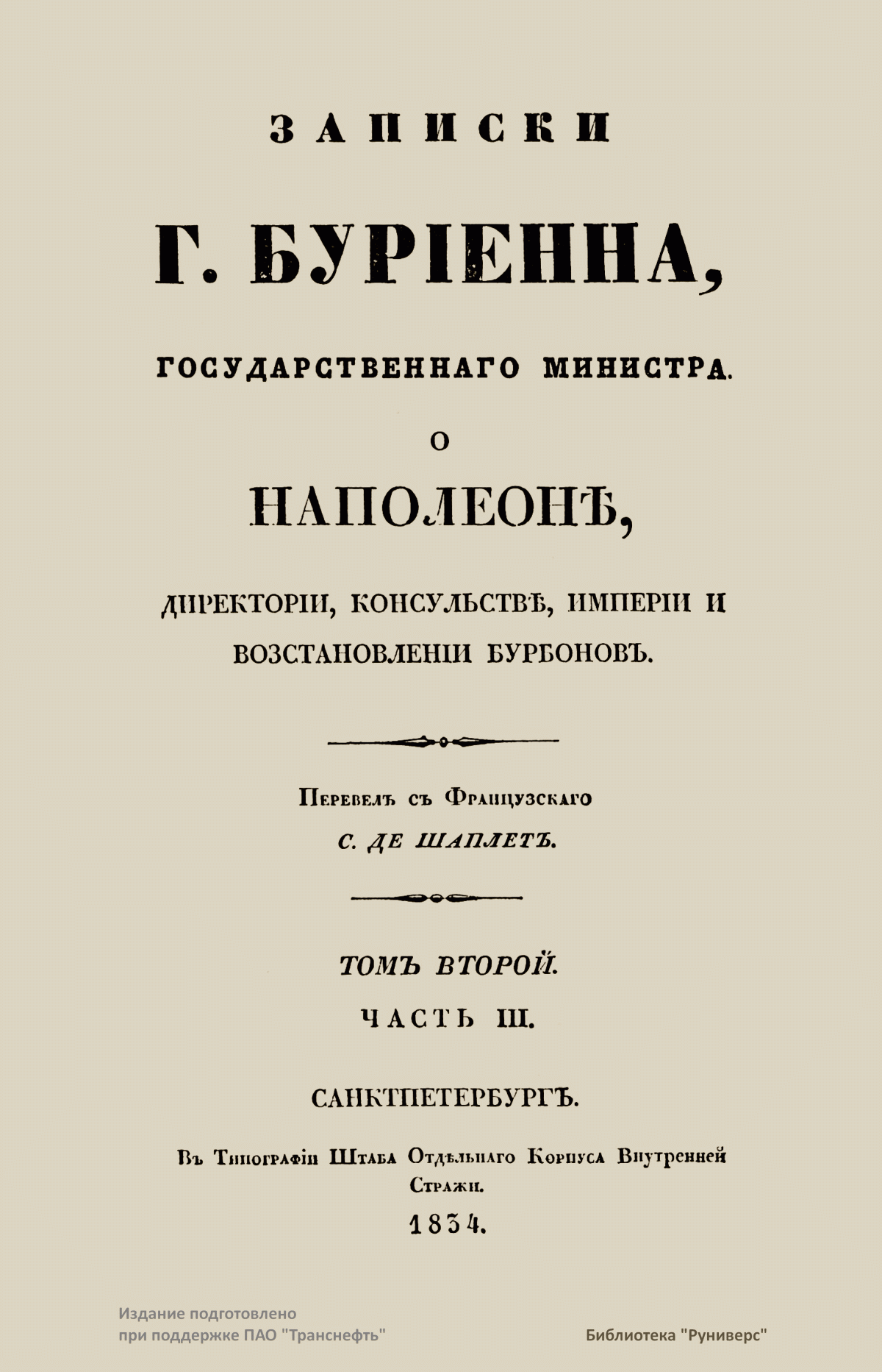 Записки г. Бурiенна, государственнаго министра о Наполеонѣ, директорiи, консульствѣ, Имперiи и возстановленiи Бурбоновъ. Томъ второй