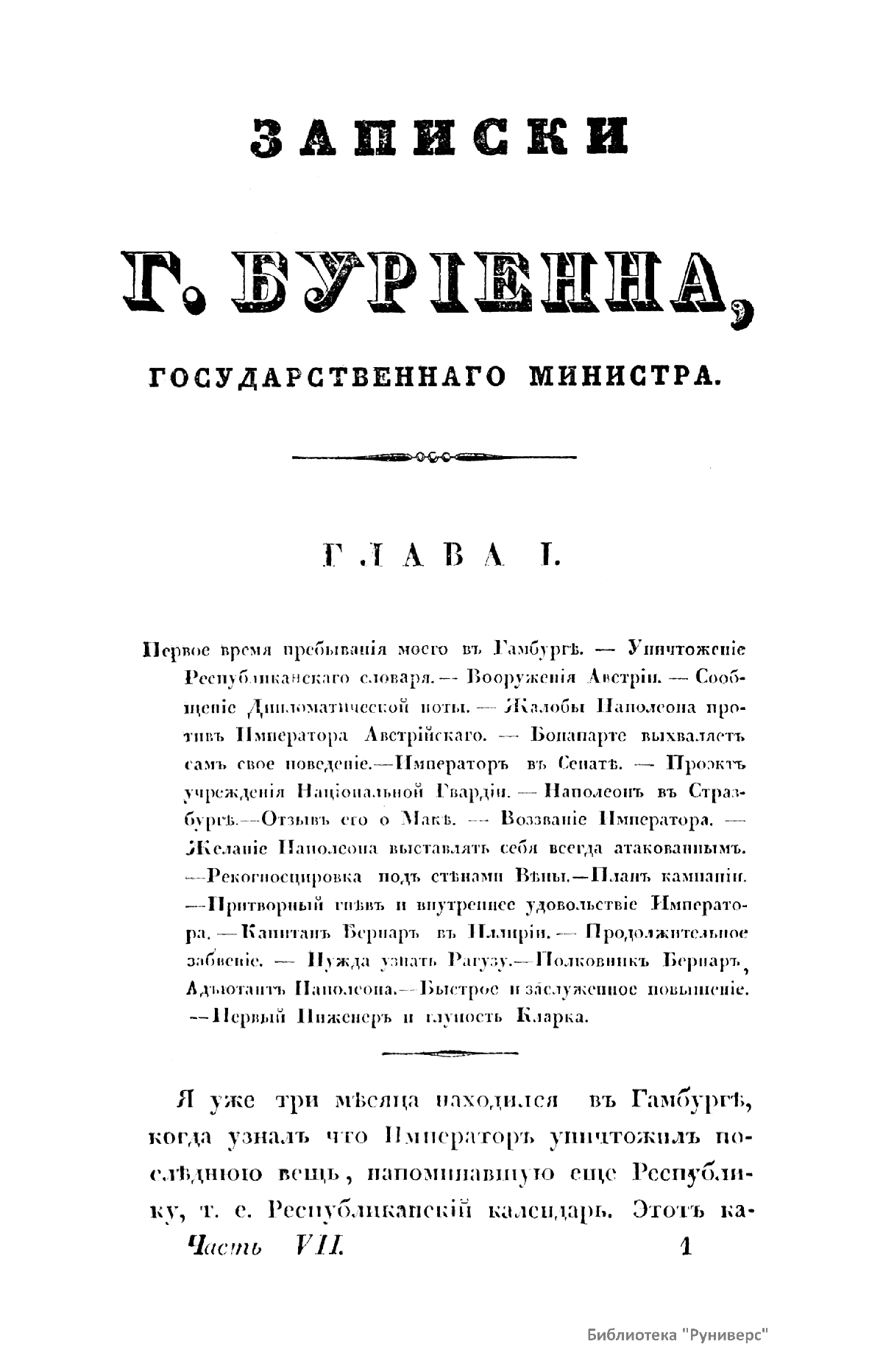 Записки Буриенна, государственного министра о Наполеоне, директории, консульстве, Империи и восстановлении Бурбонов» написаны Луи-Антуаном Буриенном (1769–1834) — французским политическим деятелем, который долгое время находился при Наполеоне, собирал информацию о нем, делал записи, имел доступ к документам. Позже, уже после смерти Бонапарта, весь накопившийся материал автор издал в форме записок. Труд его составил десять частей, объединенных в пять томов. Жанр записок был очень популярен в XIX веке. Как правило, записки написаны людьми, которые сыграли определенную роль на исторической арене, являлись свидетелями или участниками исторических событий, находились в кругу людей, играющих важные роли в истории. О Наполеоне I, как о человеке, оставившем значительный след в истории, их написано не мало.