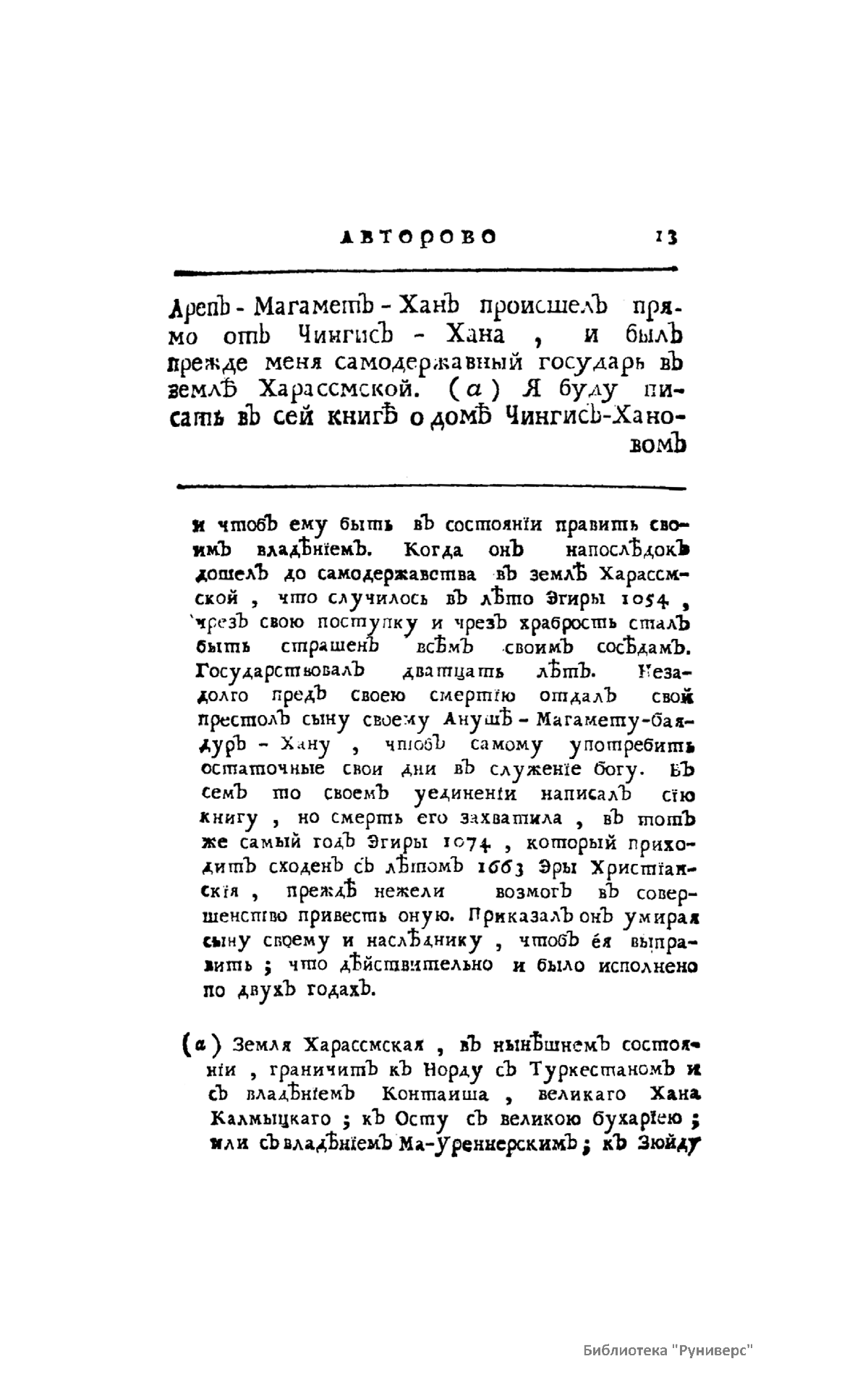 Данное издание является раритетным историческим источником по генеалогии, истории и географии тюркского этноса и Северной Азии. Это перевод на русский язык исторического труда Абулгази-Баядур-Хана «Родословное древо тюрок», написанного им в 1660–1663 годах. Закончил сочинение его сын Мухаммед Ануш, который довел повествование до 1663 года. Рукопись была открыта подполковником шведской армии Ф. И. Т. Страленбергом в Тобольске, где он находился в ссылке после Полтавского сражения (1709). Она была записана русским писцом со слов татарского переводчика. Швед Шенстрем, по поручению русского царя положивший начало научному изучению истории, географии и топографии Сибири, сделал перевод на немецкий язык. Сочинение было издано в Брюсселе Варенном (Varenne de Mondasse) в 1726 году уже на французском языке. Оно вышло под названием «Histoire généalogique des Tartares, traduite du manuscript tartare d Abulgasi-Bayadur-Chan» с подробными примечаниями Бетинка. В 1734 году Академия наук поручила В. К. Тредиаковскому перевести книгу с французского на русский язык. В 1745 году перевод был передан Г. Ф. Миллеру для «исправления» и «изъяснения» некоторых «известий», а также для составления примечаний на основании материалов, собранных им в Сибири. В 1768 году сочинение было выпущено в свет в двух томах тиражом 1512 экземпляров. В книге представлены две карты.
