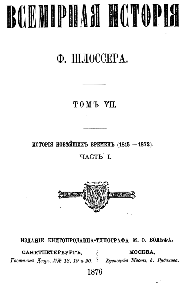 «Всемирная история» — знаменитый фундаментальный труд немецкого ученого Фридриха Кристофа Шлоссера представляет собой синтез его специальных исследований и университетских курсов. Описываемый период доведен до 1815 года.