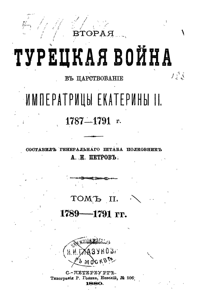 Андрей Николаевич Петров взялся за описание второй екатерининской войны с Турцией 1787 — 1791 гг., уже хорошо изучив саму эпоху по своим предыдущим работам.