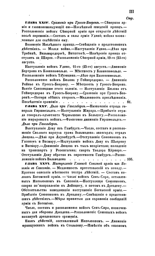 Источниками для составления «Истории войны 1813 года» служили все известнейшие книги, относящиеся к предмету, а также и многие рукописи, остававшиеся неизвестными для публики. В конце каждого из томов помещены приложения, заключающие в себе сведения о числе и составе войск, документы не вошедшие в текст, и прочее.