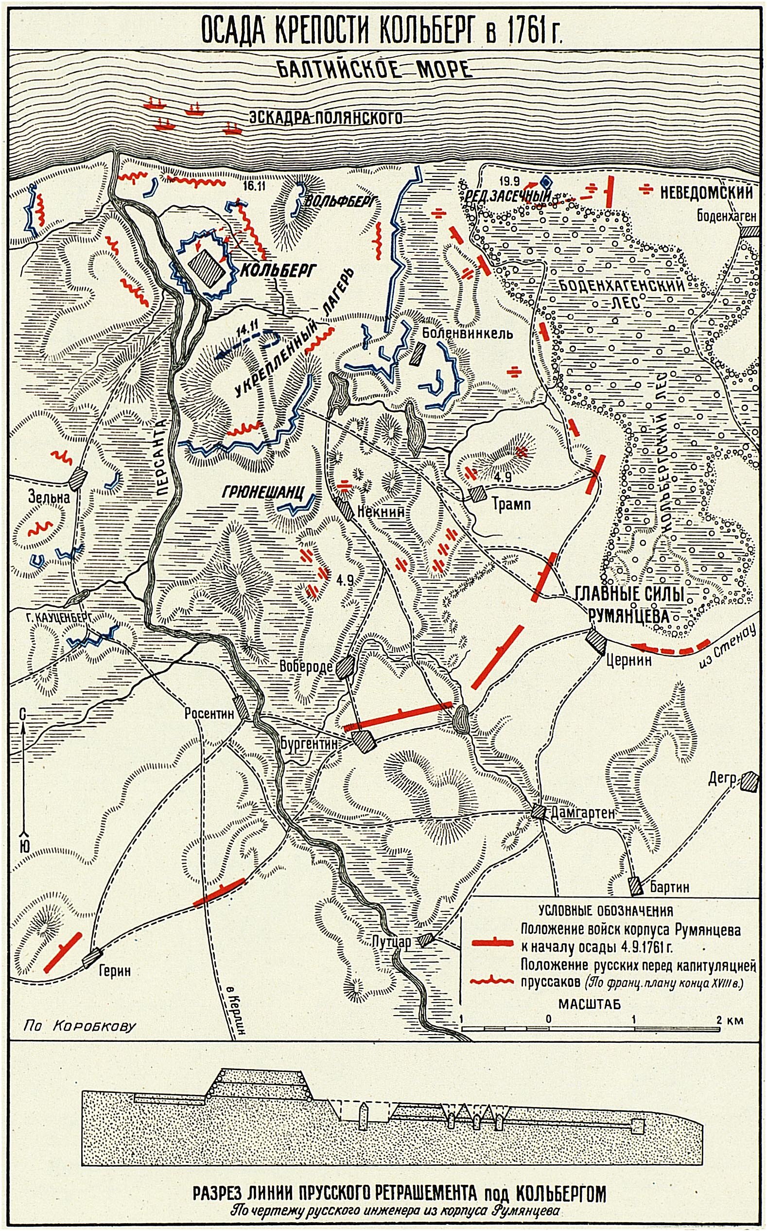 Крепость Кольберг лежит на правом берегу реки Персанты, при впадении ее в Балтийское море. К востоку от этой реки простиралась тогда болотистая, покрытая с северной своей части Кольбергским лесом, низменность. проходимая только по дорогам. Отдельные возвышенности находились лишь в некоторых местах и были заняты деревнями, В течение лета 1761 года пруссаки обратили серьезное внимание на изучение местности к востоку от реки Персанты и, в расстоянии версты с небольшим от крепости, устроили сильный укреплённый лагерь, прикрытый сплошною линией окопов, тянувшихся от реки до берега моря. Окопы эти в некоторых местах имели довольно значительные размеры и усилены были волчьими ямами: кроме того, доступ к правому флангу этой линии обеспечивался отдельным укреплением, возведенным на находившейся впереди возвышенности, называемой «Зеленою горою»: левый фланг позиции усилен был особым укреплением и засеками, устроенными в северной части Кольбергского леса.