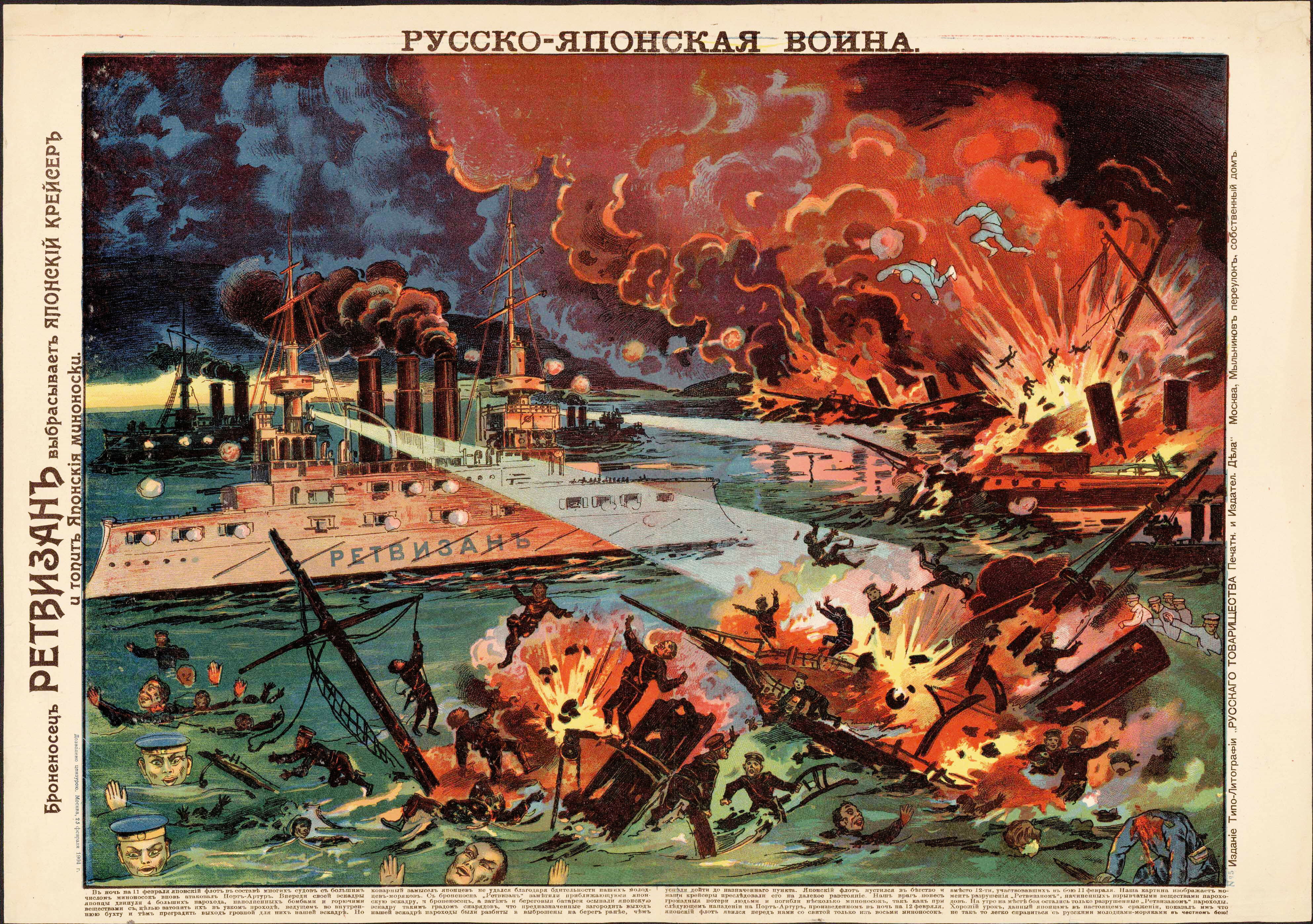 Броненосец Ретвизан выбрасывает японский крейсер и топит японские миноноски (лубок)